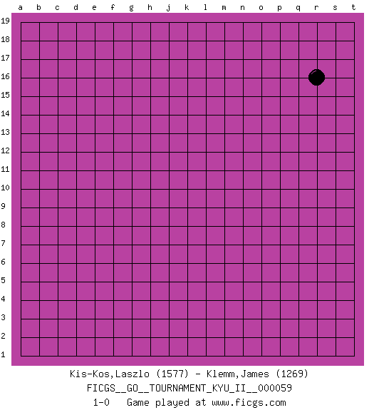 Last move : 1-0 2016 July 20 14:19:58 [Event "FICGS__GO__TOURNAMENT_KYU_II__000059"] [Site "FICGS"] [Date "2016.06.20"] [Round "1"] [Black "Kis-Kos,Laszlo"] [White "Klemm,James"] [Result "1-0"] [Rating 1 "1577"] [Rating 2 "1269"] 1.r16 1-0 This go game has been lost on time (started : 2016.06.20 9:4:27) Here are the names of the openings (joseki) played in the four corners : Player Black won this Go (weiqi, baduk) game. Follow this game move after move (download)The possibility or impossibility of an event results logically from the rules. (Pierre Audouard) Man is reluctant to give credit for intelligence to anyone, except his enemies. (Albert Einstein)