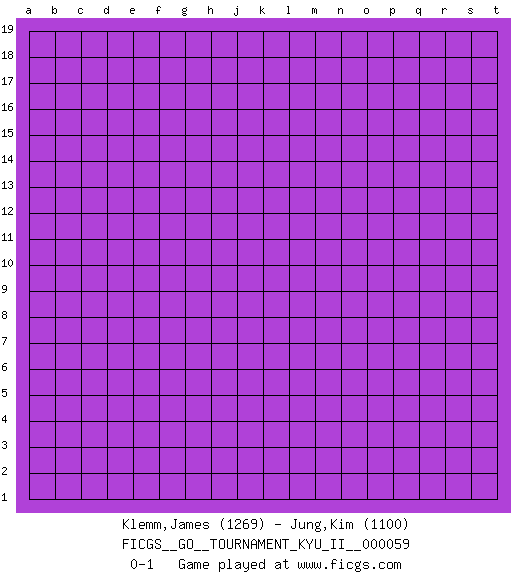 Last move : 0-1 2016 July 20 14:19:58 [Event "FICGS__GO__TOURNAMENT_KYU_II__000059"] [Site "FICGS"] [Date "2016.06.20"] [Round "1"] [Black "Klemm,James"] [White "Jung,Kim"] [Result "0-1"] [Rating 1 "1269"] [Rating 2 "1100"] 0-1 This go game has been lost on time (started : 2016.06.20 9:4:27) Here are the names of the openings (joseki) played in the four corners : Player White won this Go (weiqi, baduk) game. Follow this game move after move (download)Everything would seem to be possible in Go. Like pulling a rabbit, by a magical move, out of a hat. (Pierre Audouard) Mandala - that's it! 16x16 squares as multiple of the four and the eight because of the Four Noble Truths and the Noble Eightfold Path. (Heinz-Georg Lehnhoff about Big Chess)