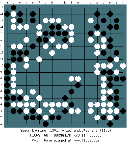 Last move : 0-1 2017 April 27 3:12:46 [Event "FICGS__GO__TOURNAMENT_KYU_II__000059"] [Site "FICGS"] [Date "2016.06.20"] [Round "1"] [Black "Segur,Laurine"] [White "Legrand,Stephane"] [Result "0-1"] [Rating 1 "1301"] [Rating 2 "1176"] 1.d4 q16 2.q4 d16 3.r8 o3 4.p3 o4 5.q12 l3 6.g3 c6 7.b5 d10 8.r14 o17 9.r16 r17 10.s16 g17 11.s17 l16 12.r18 e6 13.a8 b6 14.a5 q7 15.r7 q5 16.r5 r6 17.s6 q6 18.s4 p4 19.r3 q8 20.q9 p9 21.h16 h17 22.j16 j17 23.k15 k16 24.g15 q10 25.r9 p10 26.r11 r10 27.s10 s11 28.s12 g13 29.f14 d14 30.e13 f11 31.d12 s9 32.s8 t10 33.t8 f5 34.f4 g4 35.f2 h4 36.j2 e4 37.e3 f3 38.d2 k13 39.b11 b13 40.b12 c13 41.c11 d11 42.c12 b9 43.a9 b10 44.a10 d5 45.c5 c4 46.c3 d3 47.f4 d4 48.b3 f3 49.e2 h3 50.h2 g2 51.g1 b4 52.a4 b8 53.a6 p12 54.p18 l15 55.k14 l14 56.h13 h12 57.p14 p13 58.p16 q13 59.r13 o14 60.o15 q14 61.q15 p15 62.q17 p2 63.q2 q3 64.r1 r4 65.s5 b7 66.a7 f16 67.k3 k4 68.l4 m3 69.k5 j4 70.l6 l8 71.m7 m8 72.c17 c16 73.e18 b17 74.c18 b18 75.b19 q4 76.a18 b16 77.e17 f15 78.g14 h14 79.h15 j13 80.j15 s3 81.t3 r2 82.s2 r3 0-1 Here are the names of the openings (joseki) played in the four corners : Corner q16 : q16 q12 Hoshi (Hwajeom, Seongjeom, Xingwei`) 4-4 Point. The star or hoshi (4-4) point, emphasizing influence at the potential expense of territory. Player White won this Go (weiqi, baduk) game. Follow this game move after move (download)Avoid the plate connection. (Anonymous) Hold em is to stud what chess is to checkers. (Johnny Moss)