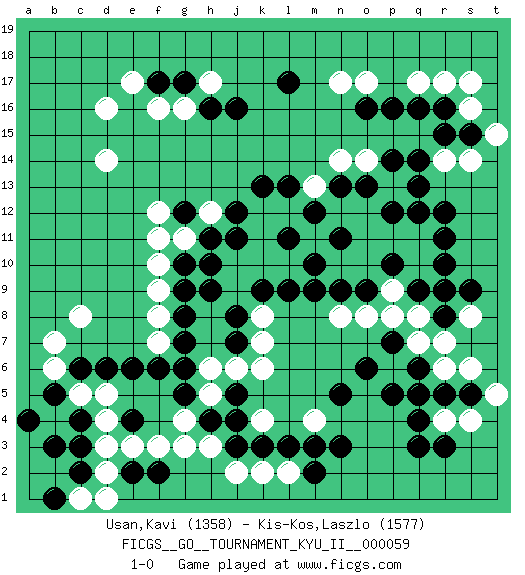 Last move : 1-0 2016 October 4 3:34:56 [Event "FICGS__GO__TOURNAMENT_KYU_II__000059"] [Site "FICGS"] [Date "2016.06.20"] [Round "1"] [Black "Usan,Kavi"] [White "Kis-Kos,Laszlo"] [Result "1-0"] [Rating 1 "1358"] [Rating 2 "1577"] 1.q16 d4 2.q3 d16 3.r9 k4 4.f17 d14 5.j16 e17 6.n3 r14 7.r12 r17 8.r16 q17 9.p16 s16 10.s15 s17 11.r15 o17 12.o16 n17 13.l17 f16 14.g17 q8 15.r8 q7 16.r5 r7 17.q9 o8 18.c6 c8 19.c3 d3 20.c4 d5 21.d6 c5 22.b5 b4 23.b3 b6 24.a4 b7 25.e6 g4 26.g6 d2 27.c2 f7 28.f6 g16 29.h16 k6 30.g7 f8 31.g8 f9 32.g9 f10 33.h4 h5 34.g5 g3 35.j5 h3 36.j4 j6 37.j3 j2 38.k3 k2 39.l3 h6 40.g10 l2 41.m2 g11 42.h11 h12 43.j11 j9 44.j8 k8 45.j7 k7 46.k9 k10 47.l9 j10 48.h10 l10 49.m9 n10 50.n9 o10 51.o9 p9 52.p10 p8 53.m10 k12 54.g12 f11 55.j12 m11 56.n11 o11 57.l11 k11 58.m12 o12 59.k13 l12 60.l13 q10 61.r10 q11 62.r11 m4 63.m3 n8 64.h9 s14 65.q12 p11 66.p14 t15 67.q14 f12 68.n5 p13 69.q13 n14 70.n13 o14 71.o13 q5 72.q4 r6 73.p5 p6 74.o6 r4 75.s5 s4 76.q6 n12 77.p12 q5 78.r3 s6 79.q6 m13 80.p10 q5 81.e2 c1 82.b1 d1 83.e4 e3 84.f2 f3 85.q6 h17 86.p7 t5 87.q5 s8 88.s9 1-0 Here are the names of the openings (joseki) played in the four corners : Corner d16 : d16 f17 Hoshi (Hwajeom, Seongjeom, Xingwei`) 4-4 Point. The star or hoshi (4-4) point, emphasizing influence at the potential expense of territory. Ikken Kakari (Hankan Keolch'im, Yi Gua`jiao~, 1-Space Low Approach). Black 2 is the standard approach move to the 4-4. Corner q16 : q16 r14 Hoshi (Hwajeom, Seongjeom, Xingwei`) 4-4 Point. The star or hoshi (4-4) point, emphasizing influence at the potential expense of territory. Ikken Kakari (Hankan Keolch'im, Yi Gua`jiao~, 1-Space Low Approach). White 2 is the standard approach move to the 4-4. Corner d4 : d4 c6 Hoshi (Hwajeom, Seongjeom, Xingwei`) 4-4 Point. The star or hoshi (4-4) point, emphasizing influence at the potential expense of territory. Ikken Kakari (Hankan Keolch'im, Yi Gua`jiao~, 1-Space Low Approach). Black 2 is the standard approach move to the 4-4. Player Black won this Go (weiqi, baduk) game. Follow this game move after move (download)Don't make compact groups of stones. (Anonymous) Kids, you tried your best and you failed miserably. The lesson is, never try. (Simpsons)