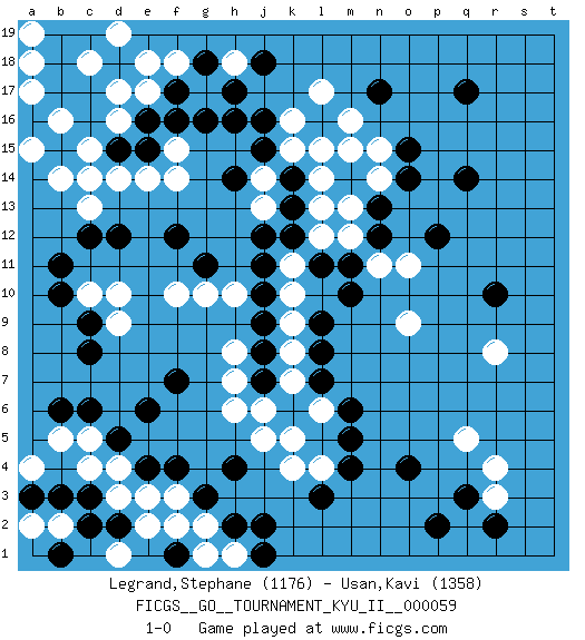 Last move : 1-0 2017 January 1 16:20:15 [Event "FICGS__GO__TOURNAMENT_KYU_II__000059"] [Site "FICGS"] [Date "2016.06.20"] [Round "1"] [Black "Legrand,Stephane"] [White "Usan,Kavi"] [Result "1-0"] [Rating 1 "1176"] [Rating 2 "1358"] 1.q17 d4 2.q3 d16 3.f17 d14 4.j16 q5 5.o4 r3 6.r2 r4 7.p2 r8 8.q14 k4 9.c12 c13 10.d12 d10 11.f12 e17 12.f16 f14 13.c17 d17 14.e15 e14 15.d15 c15 16.c16 c18 17.b18 f18 18.g18 e18 19.b15 c14 20.h16 b14 21.b11 b16 22.b17 a15 23.c19 d19 24.d18 f15 25.e16 c18 26.b19 a17 27.d18 g17 28.g16 c18 29.c6 a18 30.d18 h18 31.h17 c18 32.f4 a19 33.e6 f10 34.c9 c10 35.b10 d9 36.c8 h10 37.h4 c5 38.b6 b5 39.c3 d3 40.d2 e2 41.c2 f3 42.g3 g2 43.h2 h1 44.j1 g1 45.j2 d1 46.e4 e3 47.f1 f2 48.a3 b2 49.b3 a4 50.d5 c4 51.b1 a2 52.g11 g10 53.r10 l17 54.n17 l15 55.j18 m16 56.o15 n15 57.o14 n14 58.n13 m13 59.n12 m12 60.m11 n11 61.m10 o11 62.p12 o9 63.k12 j14 64.h14 j13 65.j12 l12 66.l11 l14 67.m14 m15 68.k13 l13 69.k14 k15 70.j15 k16 71.j8 h7 72.j7 h6 73.f7 h8 74.j9 j6 75.k6 j5 76.l3 l4 77.m5 l6 78.m4 k7 79.l7 k8 80.m6 k5 81.l8 k9 82.j10 k10 83.j11 k11 84.l9 1-0 Here are the names of the openings (joseki) played in the four corners : Corner d16 : d16 f17 Hoshi (Hwajeom, Seongjeom, Xingwei`) 4-4 Point. The star or hoshi (4-4) point, emphasizing influence at the potential expense of territory. Ikken Kakari (Hankan Keolch'im, Yi Gua`jiao~, 1-Space Low Approach). Black 2 is the standard approach move to the 4-4. Corner q4 : q3 q5 Komoku (Somok, Xiao~mu`) 3-4 Point. The komoku (3-4) point is the traditional corner enclosure move.. Ikken Takagakari (Hankan Nop'dakeolch'im, Yi Gaogua`jiao~, 1-Space High Approach). The 5-4 approach move has become more popular in modern times, as modern Go emphasizes speed and influence. Corner d4 : d4 c6 Hoshi (Hwajeom, Seongjeom, Xingwei`) 4-4 Point. The star or hoshi (4-4) point, emphasizing influence at the potential expense of territory. Ikken Kakari (Hankan Keolch'im, Yi Gua`jiao~, 1-Space Low Approach). Black 2 is the standard approach move to the 4-4. Player Black won this Go (weiqi, baduk) game. Follow this game move after move (download)If your stone is capped, play the knight's move. (Anonymous) True nature is revealed in times of difficulty. (Chinese proverb)
