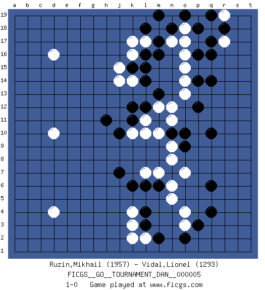 Last move : 1-0 2007 June 16 13:52:29 [Event "FICGS__GO__TOURNAMENT_DAN__000005"] [Site "FICGS"] [Date "2007.03.26"] [Round "1"] [Black "Ruzin,Mikhail"] [White "Vidal,Lionel"] [Result "1-0"] [Rating 1 "1957"] [Rating 2 "1293"] 1.q16 d4 2.q4 d16 3.q10 o17 4.m17 o15 5.q14 k17 6.l16 k16 7.l14 o13 8.p14 o14 9.p16 o16 10.p12 m12 11.m13 n12 12.l12 l11 13.k12 k14 14.k15 j15 15.l15 j14 16.k11 l10 17.n10 k10 18.h11 d10 19.m11 m18 20.n18 n17 21.l18 l17 22.m16 o18 23.m19 r17 24.q17 q18 25.p18 p19 26.r18 r19 27.q19 n11 28.o19 m10 29.j10 n9 30.o10 m7 31.j7 k4 32.l6 n5 33.m6 n6 34.n7 l7 35.k6 o7 36.o9 n8 37.l4 o3 38.p3 o4 39.q6 k3 40.l3 l2 41.m2 k2 42.o2 1-0 This go game has been lost on time (started : 2007.03.26 2:51:52) Here are the names of the openings (joseki) played in the four corners : Corner q16 : q16 o17 Hoshi (Hwajeom, Seongjeom, Xingwei`) 4-4 Point. The star or hoshi (4-4) point, emphasizing influence at the potential expense of territory. Ikken Kakari (Hankan Keolch'im, Yi Gua`jiao~, 1-Space Low Approach). White 2 is the standard approach move to the 4-4. Corner q4 : q4 n9 Hoshi (Hwajeom, Seongjeom, Xingwei`) 4-4 Point. The star or hoshi (4-4) point, emphasizing influence at the potential expense of territory. Corner d4 : d4 j7 Hoshi (Hwajeom, Seongjeom, Xingwei`) 4-4 Point. The star or hoshi (4-4) point, emphasizing influence at the potential expense of territory. Player Black won this Go (weiqi, baduk) game. Follow this game move after move (download)Always remember, keep the balance. [between territory and influence] (Figaro) Crush them ! Make them suffer ! (General Grievous in Star Wars ep.3)