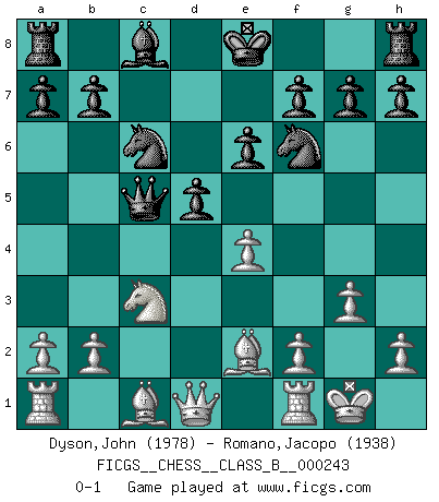 Last move : 0-1 2016 September 30 23:29:3 [Event "FICGS__CHESS__CLASS_B__000243"] [Site "FICGS"] [Date "2016.06.20"] [Round "1"] [White "Dyson,John"] [Black "Romano,Jacopo"] [Result "0-1"] [WhiteElo "1978"] [BlackElo "1938"] 1.Nf3 Nf6 2.c4 c5 3.Nc3 Nc6 4.d4 cxd4 5.Nxd4 e6 6.g3 Qb6 7.Nb3 Ne5 8.e4 Bb4 9.c5 Bxc5 10.Nxc5 Qxc5 11.Be2 Nc6 12.O-O d5 0-1 This chess game has been lost on time (started : 2016.06.20 10:51:53) Reti Opening Kingside Castling by player White (move 12) Player Black won this chess game. Follow this game move after move (download)I give 98 percent of my mental energy to Chess. Others give only 2 percent. (Bobby Fischer) Alles was am Schachbrett zählt sind gute Züge. (Robert James Fischer) Un juego de Ajedrez es un dialogo, una conversación entre un jugador y su oponente. Cada movimiento del oponente puede contener amenazas o tropiezos, pero un jugador no se puede defender de las amenazas o tomar ventaja de los tropiezos si es que no se pregunta a sí mismo: ¿Que es lo que mi oponente va a hacer después de cada movida?. (Bruce A. Moon) Plusieurs personnes se sont demandées comment Tal faisait pour gagner... En fait, c'est très simple ! Il met ses pièces au centre de l'échiquier et les sacrifie quelque part ! (David Bronstein) The existence of forgetting has never been proved: We only know that some things don't come to mind when we want them. (Friedrich Nietzsche)