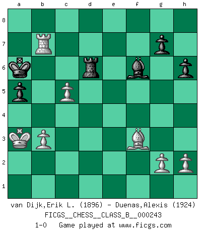Last move : 1-0 2016 September 30 16:3:44 [Event "FICGS__CHESS__CLASS_B__000243"] [Site "FICGS"] [Date "2016.06.20"] [Round "1"] [White "van Dijk,Erik L."] [Black "Duenas,Alexis"] [Result "1-0"] [WhiteElo "1896"] [BlackElo "1924"] 1.e4 c5 2.Nf3 d6 3.d4 cxd4 4.Nxd4 Nf6 5.Nc3 a6 6.Bg5 e6 7.f4 h6 8.Bh4 Be7 9.Qf3 Qc7 10.O-O-O Nbd7 11.Be2 b5 12.Bxf6 Nxf6 13.e5 Bb7 14.Qg3 dxe5 15.fxe5 Nd5 16.Nxe6 fxe6 17.Qg6+ Kd7 18.Bg4 Qxe5 19.Nxd5 Qg5+ 20.Qxg5 Bxg5+ 21.Kb1 Bxd5 22.Rxd5+ Kc7 23.Rc5+ Kb6 24.Re5 Rae8 25.Rhe1 Rhf8 26.Rxe6+ Rxe6 27.Rxe6+ Ka7 28.Bf3 Rb8 29.c3 Rf8 30.Kc2 Rd8 31.Kb3 Rd2 32.Re8 Rd8 33.Re4 Rd2 34.a4 bxa4+ 35.Rxa4 Kb6 36.Rb4+ Kc5 37.Rc4+ Kb5 38.Rc7 Bf6 39.Ka3 a5 40.b3 Rd6 41.c4+ Kb6 42.Rb7+ Ka6 43.c5 1-0 Sicilian : Najdorf, 7.f4 Queenside Castling by player White (move 10) Player White won this chess game. Follow this game move after move (download)Chess mastery essentially consists of analyzing Chess positions accurately. (Mikhail Botvinnik) Die Elozahlen sind sehr schlecht für das Schach. Jetzt ist Schach eine Sportindustrie, die darauf zielt Elopunkte zu machen. (Miguel Najdorf) En la perfecta combinación de Ajedrez como en una historia corta de primera clase, toda la trama y contra trama deberá conducir hacia un final sorprendente, el interes no es mitigado hasta el último momento. (Yates and Winter) Les échecs sont utiles à l'exercice de la faculté de penser et à celle de l'imagination. Car nous devons posséder une méthode élaborée pour atteindre des buts partout où nous devons conduire notre raison. (Leibnitz) History is a gallery of pictures in which there are few originals and many copies. (Alexis de Tocqueville)