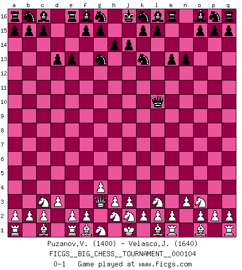 Last move : 0-1 2016 July 31 5:1:24 [Event "FICGS__BIG_CHESS__TOURNAMENT__000104"] [Site "FICGS"] [Date "2016.06.22"] [Round "1"] [White "Puzanov,Vasyl"] [Black "Velasco,Jose Maria"] [Result "0-1"] [WhiteElo "1400"] [BlackElo "1640"] 1.g2-g4 j15-k13 2.b1-c3 h16-o10 3.h1-f3 h15-g13 4.p1-o3 e15-e13 5.f3-g3 o10-l10 6.k1-l3 d15-d13 7.d2-d3 n15-n13 8.n2-n3 m15-m13 0-1 This big chess game has been lost on time (started : 2016.06.22 22:21:59) Follow this game move after move (download)Who is your opponent tonight, tonight I am playing against the Black pieces. (Akiba Rubinstein) Fallen sollten polizeilich verboten werden. (Savielly Grigorievitsch Tartakower) Mi estilo es algo parecido entre un poco de Tal y Petrosian. (Reshevsky) Je menace de comprendre la position. (Anonyme) There is no instance of a country having benefited from prolonged warfare. (Sun Tzu)
