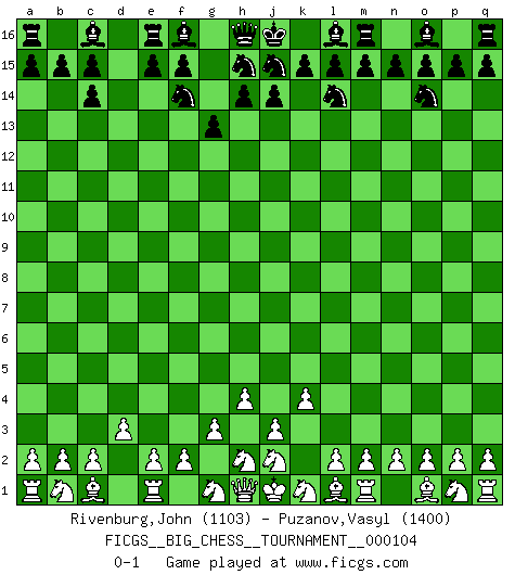 Last move : 0-1 2016 August 23 8:33:53 [Event "FICGS__BIG_CHESS__TOURNAMENT__000104"] [Site "FICGS"] [Date "2016.06.22"] [Round "1"] [White "Rivenburg,John"] [Black "Puzanov,Vasyl"] [Result "0-1"] [WhiteElo "1103"] [BlackElo "1400"] 1.h3-h4 p16-o14 2.g2-g3 b16-c14 3.f1-l6 g15-g13 4.k2-k4 k16-l14 5.l6-c14 d15-c14 6.d2-d3 g16-f14 0-1 This big chess game has been lost on time (started : 2016.06.22 22:21:59) Follow this game move after move (download)Chess teaches you to control the initial excitement you feel when you see something that looks good and it trains you to think objectively when you're in trouble. (Stanley Kubrick) Ein typischer, sehr verbreiteter Gedankenschädling ist der, daß der betreffende Amateur von der Annanhme ausgeht, daß jeder einzelne Zug etwas zu leisten habe. (Aaron Nimzowitsch) El Ajedrez no es una pizca de inferior al violín, y tenemos un gran número de violinistas profesionales. (Mikhail Botvinnik) La menace est plus forte que l'exécution. (Aaron Nimzovitch) Macintosh - we might not get everything right, but at least we knew the century was going to end. (Douglas Adams)