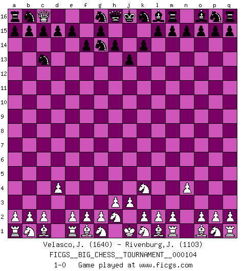 Last move : 1-0 2016 July 30 16:58:2 [Event "FICGS__BIG_CHESS__TOURNAMENT__000104"] [Site "FICGS"] [Date "2016.06.22"] [Round "1"] [White "Velasco,Jose Maria"] [Black "Rivenburg,John"] [Result "1-0"] [WhiteElo "1640"] [BlackElo "1103"] 1.j2-k4 j14-j13 2.h1-o7 h15-g13 3.n2-n4 f15-f14 4.o7-e16 g13-e14 5.e16-c16 e14-c13 6.c16-f16 j15-g14 7.f16-c16 k15-k14 8.d2-d4 1-0 This big chess game has been lost on time (started : 2016.06.22 22:21:59) Follow this game move after move (download)Bobby Fischer's current state of mind is indeed a tragedy. One of the world's greatest Chess players - the pride and sorrow of American Chess. (Frank Brady) Du musst nicht gut spielen, es reicht, wenn du besser spielst als dein Gegner. (Anonymous) Cuando la partida de Ajedrez termina, el Peón y el Rey regresan a la misma caja. (Irish saying) Les ravages du H expliquent la différence de niveau entre Tal et Thal [Abergel]. I teach you to lie, cheat and steal, and as soon as my back's turned you wait in line ? (Gregory House, House M.D.)