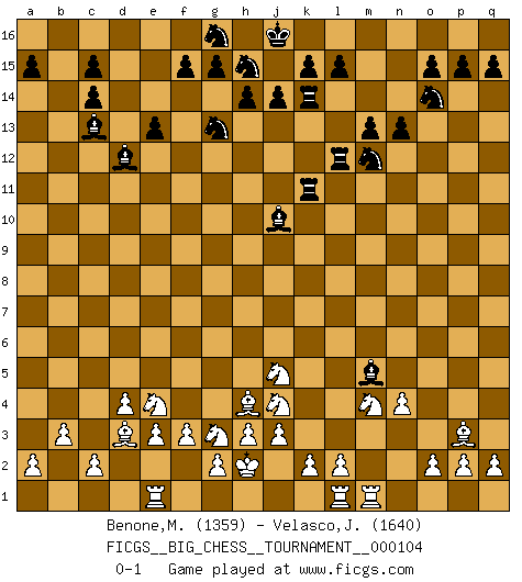 Last move : 0-1 2016 August 21 10:43:7 [Event "FICGS__BIG_CHESS__TOURNAMENT__000104"] [Site "FICGS"] [Date "2016.06.22"] [Round "1"] [White "Benone,Mateia"] [Black "Velasco,Jose Maria"] [Result "0-1"] [WhiteElo "1359"] [BlackElo "1640"] 1.j2-k4 h15-g13 2.p1-o3 j15-k13 3.d2-d3 h16-o10 4.h2-g4 n15-n13 5.g1-f3 o16-d6 6.k1-h2 d15-d13 7.b1-c3 m15-m13 8.m2-m4 l16-p12 9.c3-e4 d6-a9 10.f3-h4 e15-e13 11.c1-h6 o10-h10 12.h6-j5 f16-a11 13.h4-f3 c16-l8 14.j1-k1 h10-j10 15.j5-g3 a9-c11 16.n2-n4 m16-m14 17.e2-e3 m14-k14 18.f3-h4 p16-o14 19.o1-l4 k13-m12 20.m1-m3 q16-m16 21.l1-o4 m16-m14 22.q1-m1 m14-l14 23.f2-f3 j10-l10 24.l4-o7 l10-o13 25.o4-g11 k14-k7 26.o7-m5 k7-p7 27.g11-p3 b16-c14 28.d3-d4 e16-e14 29.m5-d13 e14-d14 30.d13-m5 a16-d16 31.h1-k3 o13-l10 32.f1-d3 l10-b10 33.b2-b3 a11-b12 34.h4-j2 l14-k14 35.g3-h4 b10-q10 36.m3-l3 p7-p10 37.k3-l4 p10-l10 38.l4-g8 d14-d12 39.m5-j8 l10-l13 40.e1-e2 k16-h15 41.j8-c14 b15-c14 42.l3-l5 l8-j10 43.g8-h8 l13-l5 44.h8-l5 q10-l5 45.m4-l5 d12-k12 46.h4-e7 k12-l12 47.h2-j4 d16-d7 48.e7-f6 d7-k7 49.l5-l6 k7-k11 50.k4-m5 l12-l6 51.f6-h4 p12-h5 52.g4-h2 k14-l14 53.o3-m4 l6-l12 54.j2-g3 h5-f7 55.k1-j2 c11-d12 56.h2-k3 f7-g8 57.a1-l1 g8-l4 58.e2-e1 b12-c13 59.j2-h2 l14-k14 60.k3-j5 l4-m5 0-1 Follow this game move after move (download)A thorough understanding of the typical mating continuations makes the most complicated sacrificial combinations leading up to them not only not difficult, but almost a matter of course. (Siegbert Tarrasch) Der Knackpunkt bei der Konzentration ist, daß wir nur durch sie etwas Neues und Ungewöhnliches am Schachbrett finden können. Sie ist der einzige Weg durch neue neue Ideen eine Überraschung zu bereiten. (Garry Kasparov) Una compensación adecuada por un sacrificio es tener una combinación sólida que conduce a una posición ganadora; una compensación adecuada por una metida de pata es dejar a tu oponente arrebatar una derrota de las fauces de la victoria. (Bruce A. Moon) Le profane ne songe pas à la somme de jouissance dont il se prive, qui méconnaît ce jeu aux ressources aussi variées que passionnantes. (Jean-Marie Jeanton-Lamarche) We need strong personalities and only one world champion to attract sponsors. (Anatoly Karpov)