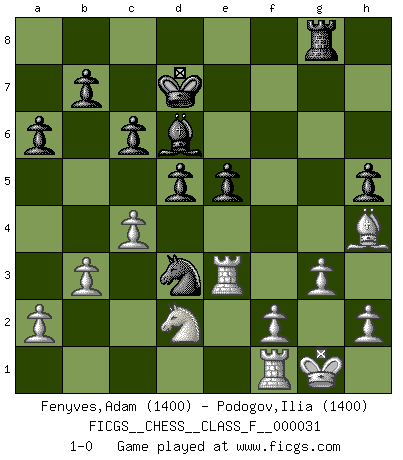Last move : 1-0 2007 June 10 19:1:52 [Event "FICGS__CHESS__CLASS_F__000031"] [Site "FICGS"] [Date "2007.03.26"] [Round "1"] [White "Fenyves,Adam"] [Black "Podogov,Ilia"] [Result "1-0"] [WhiteElo "1400"] [BlackElo "1400"] 1.e4 e5 2.d4 exd4 3.c3 Nf6 4.Qxd4 Nc6 5.Qa4 d5 6.e5 Ng4 7.Nf3 Bd7 8.Bb5 Ngxe5 9.Nxe5 Qf6 10.Nxd7 Kxd7 11.O-O Bd6 12.Qg4+ Qe6 13.Qxg7 Rag8 14.Qh6 Qg4 15.g3 Rg6 16.Qe3 a6 17.Be2 Qe6 18.Qxe6+ Rxe6 19.Bg4 h5 20.Bxe6+ fxe6 21.Bg5 Ne5 22.Nd2 Nd3 23.b3 e5 24.Rad1 Rg8 25.Bh4 Nb2 26.Rb1 Nd3 27.c4 c6 28.Rbd1 Nb2 29.Rde1 Nd3 30.Re3 1-0 Danish gambit Kingside Castling by player White (move 11) Player White won this chess game. Follow this game move after move (download)Many Chess players were surprised when after the game, Fischer quietly explained: 'I had already analyzed this possibility' in a position which I thought was not possible to foresee from the opening. (Mikhail Tal) Kleine Schachspieler machen Mist, und große Schachspieler machen Mist, aber große machen weniger Mist. (Fritz Sämisch) No hay un Gran Maestro de Ajedrez que sea normal; solo se diferencían ellos por la magnitud de su locura. (Viktor Korchnoi) Tout change constamment, y compris dans le monde des Echecs. (Botvinnik) Opportunities multiply as they are seized. (Sun Tzu)