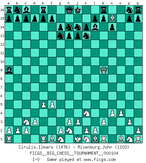 Last move : 1-0 2016 August 9 18:45:49 [Event "FICGS__BIG_CHESS__TOURNAMENT__000104"] [Site "FICGS"] [Date "2016.06.22"] [Round "1"] [White "Cirulis,Ilmars"] [Black "Rivenburg,John"] [Result "1-0"] [WhiteElo "1476"] [BlackElo "1103"] 1.d2-d3 j14-j13 2.m2-m3 h14-h13 3.p2-p3 j15-k13 4.o2-o4 h15-g13 5.j2-k4 k16-j14 6.b1-c3 g16-h14 7.e2-e4 g15-g14 8.f2-f4 f16-g15 9.f4-f5 g15-a9 10.n2-n4 n15-n14 11.e4-e5 o16-m14 12.h1-o7 k15-k14 13.o7-o15 m14-o16 14.o15-o11 l16-k15 15.o11-m9 k15-l14 16.c1-p13 o16-n15 17.p13-n15 1-0 Follow this game move after move (download)Place the contents of the Chess box in a hat, shake them up vigorously, pour them on the board from a height of two feet, and you get the style of Steinitz. (H. E. Bird) Spiel ein langweiliges Spiel zu Ende und lustige Dinge können passieren. (Hans Ree) Un buen sacrificio es aquel que aunque no sea necesariamente sólido, deja a tu oponente aturdido y confuso. (Rudolph Spielmann) J'ai toujours senti une vague pitié pour l'homme qui ne connaît rien aux échecs, tout comme j'en aurais pour un homme ignorant de l'amour. Les Echecs, comme la musique ou comme l'amour, ont le pouvoir de rendre heureux. (Siegbert Tarrasch) Every man's memory is his private literature. (Aldous Huxley)