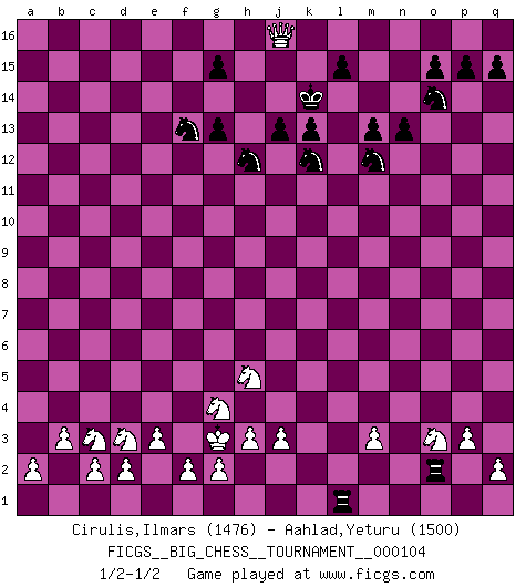 Last move : 1/2-1/2 2016 October 30 19:33:2 [Event "FICGS__BIG_CHESS__TOURNAMENT__000104"] [Site "FICGS"] [Date "2016.06.22"] [Round "1"] [White "Cirulis,Ilmars"] [Black "Aahlad,Yeturu"] [Result "1/2-1/2"] [WhiteElo "1476"] [BlackElo "1500"] 1.b2-b3 m15-m13 2.c1-a3 k16-l14 3.p2-p3 j15-k13 4.o1-q3 h16-o10 5.h2-g4 o10-o2 6.m1-o1 o2-l5 7.o1-o5 l5-l2 8.p1-o3 d15-d13 9.j2-k4 l2-c10 10.o5-c5 c10-k10 11.q3-c16 e16-c16 12.g1-f3 h15-g13 13.m2-m3 l16-o13 14.l1-p5 k10-a1 15.b1-c3 a1-e1 16.f3-e1 n15-n13 17.c5-a5 o16-a3 18.a5-a3 e15-e13 19.h1-n6 b16-c14 20.q1-l1 g16-f14 21.a3-a7 f16-b12 22.e2-e3 p16-o14 23.f1-d3 o13-d3 24.e1-d3 m16-m14 25.n6-p6 q16-p16 26.p5-g13 h14-g13 27.p6-f15 j16-h15 28.a7-h7 k13-h12 29.f15-j12 f14-h13 30.h7-f7 c16-f16 31.f7-f16 a16-f16 32.l1-l9 f16-f10 33.j12-d7 c14-d12 34.k4-h5 h13-k12 35.l9-b9 a15-a13 36.d7-c7 f10-c10 37.c7-e7 c10-e10 38.e7-c7 c15-c13 39.b9-g9 h15-h14 40.k1-l3 p16-f16 41.c7-g3 f16-f10 42.g4-f6 f10-g10 43.g9-g10 e10-g10 44.g3-h2 l14-m12 45.f6-g4 m14-l14 46.h2-d6 j14-j13 47.d6-o6 l14-l10 48.o6-p7 l10-p10 49.p7-q7 k15-k13 50.q7-l7 g10-l10 51.l7-e13 b12-l3 52.k2-l3 l10-l3 53.e13-d13 p10-k10 54.d13-c13 l3-l1 55.j1-h2 k10-k2 56.h2-g3 d12-f13 57.c13-b14 h14-h13 58.b14-b15 k2-n2 59.b15-f15 h13-g12 60.f15-c12 g12-h13 61.c12-e10 h13-h14 62.e10-a14 h14-h13 63.a14-a13 n2-o2 64.a13-a6 h13-h14 65.a6-a14 h14-h13 66.a14-e10 h13-h14 67.e10-e14 h14-h13 68.e14-e16 h13-j14 69.e16-j16 j14-k14 70.j16-k16 k14-l14 71.k16-j16 l14-k14 1/2-1/2 Follow this game move after move (download)I play correspondence chess because it is both art and science while chess is art only. (A player at FICGS) Bobby Fischer ist kein Vorbild für die heutige Jugend. (Viktor Kortschnoi) Yo no le temo a Spassky. Todos saben que yo soy el mejor. Uno no necesita un torneo para probarlo. (Bobby Fischer) La victoire dans une partie d'Echecs appartient la plupart du temps à celui qui voit un peu plus loin que l'adversaire. (Lasker) Luck never made a man wise. (Seneca, Letters to Lucilius)