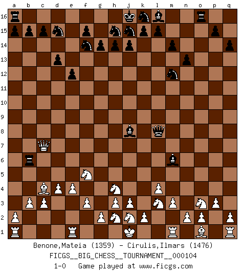 Last move : 1-0 2016 August 18 20:59:44 [Event "FICGS__BIG_CHESS__TOURNAMENT__000104"] [Site "FICGS"] [Date "2016.06.22"] [Round "1"] [White "Benone,Mateia"] [Black "Cirulis,Ilmars"] [Result "1-0"] [WhiteElo "1359"] [BlackElo "1476"] 1.j2-h4 n15-n14 2.h1-o7 g15-g14 3.o7-o15 p16-q14 4.o15-o4 h16-c11 5.c2-c3 o16-f8 6.m2-m3 q16-o16 7.o4-p3 q14-o13 8.l1-m2 e15-e13 9.m2-f8 c11-f8 10.f2-f3 f16-d14 11.d2-d4 e13-e12 12.p3-q4 q15-q14 13.c1-l9 e16-e13 14.p1-o3 e13-l13 15.l9-j11 f8-l8 16.l2-l4 l13-b13 17.j11-o16 m16-o16 18.b2-b3 d14-e15 19.q4-n4 g16-f14 20.e2-e4 d15-d13 21.f1-c4 m15-m14 22.b1-a3 n14-n13 23.a3-b5 o13-m12 24.b5-d6 c16-k9 25.k1-l3 b16-d15 26.g1-j2 e15-d14 27.p2-p3 k9-j8 28.n4-n7 b13-b6 29.d6-f5 d14-m6 30.n7-c7 1-0 Follow this game move after move (download)Morphy was probably the greatest genius of them all. (Bobby Fischer) Das Schachspiel übertrifft alle anderen Spiele so weit wie der Chimborasso einen Misthaufen. (Arthur Schopenhauer) En un gambito tu regalas un Peón por el bién de tomar un juego perdido. (Samuel Standige Boden) Le jeu d'échecs fait naître et fortifie en nous plusieurs qualités précieuses dans le cours de l'existence, telles que la prévoyance, la circonspection, la prudence, et la persévérance. (Benjamin Franklin - 1783, la morale des échecs) Kids, you tried your best and you failed miserably. The lesson is, never try. (Simpsons)