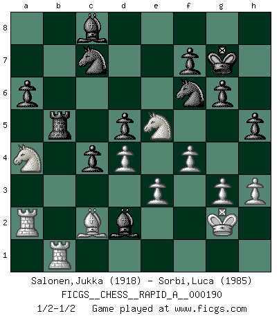 Last move : 1/2-1/2 2016 September 24 6:56:6 [Event "FICGS__CHESS__RAPID_A__000190"] [Site "FICGS"] [Date "2016.06.23"] [Round "1"] [White "Salonen,Jukka"] [Black "Sorbi,Luca"] [Result "1/2-1/2"] [WhiteElo "1918"] [BlackElo "1985"] 1.d4 Nf6 2.c4 e6 3.Nf3 b6 4.e3 Bb7 5.Nc3 Bb4 6.Bd3 O-O 7.O-O d5 8.cxd5 exd5 9.a3 Bd6 10.b4 a6 11.Ne5 Nbd7 12.f4 c5 13.bxc5 bxc5 14.Rb1 Rb8 15.Bd2 Qc7 16.Qa4 c4 17.Bf5 Nb6 18.Qa5 Nc8 19.Na4 Qxa5 20.Bxa5 Ne7 21.Bc2 h5 22.h3 Rfe8 23.Rb6 Nc8 24.Rb2 Bxa3 25.R2b1 Na7 26.Bc7 Nb5 27.Bxb8 Rxb8 28.g3 Bd6 29.Rb2 g6 30.Ra1 Bc8 31.Nc5 Kg7 32.Kg2 Rb6 33.Bd1 Ne8 34.Rf2 Nf6 35.Rc1 Nc7 36.Ra2 Rb5 37.Ba4 Rb4 38.Bc2 Rb5 39.Na4 Bb4 40.Rb1 Bd2 1/2-1/2 Queen's Indian : 4.e3 Kingside Castling by player Black (move 6) Kingside Castling by player White (move 7) This chess game ended in a draw. Follow this game move after move (download)A player surprised is half beaten. (Proverb) Obwohl ich vom Stil her kaum zu den Priestern der Schachkunst gezählt werde, halte ich Schach doch für eine Kunst. (Tigran Petrosjan) El poder defensivo de una pieza clavada, solamente es imaginario. (Aaron Nimzovich) Roi des jeux et jeu des rois, les échecs portent en eux un sentiment d'infini. Ils donnent à celui qui s'est efforcé d'en approfondir les arcanes l'impression de n'être pas à la mesure de l'homme; en fait, ils constituent un résumé de l'univers, un microcosme, et figurent cette grande échelle qui, dans les plans de la lumière descend jusqu'à la matière, qui des abîmes insondables remonte jusqu'en l'infini de Dieu. (Pyrame) An expert is a man who has made all the mistakes which can be made in a very narrow field. (Niels Bohr)
