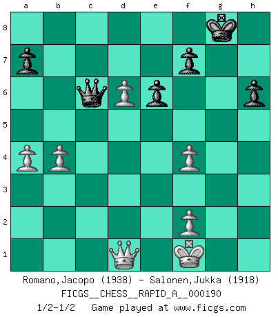 Last move : 1/2-1/2 2016 August 15 8:18:55 [Event "FICGS__CHESS__RAPID_A__000190"] [Site "FICGS"] [Date "2016.06.23"] [Round "1"] [White "Romano,Jacopo"] [Black "Salonen,Jukka"] [Result "1/2-1/2"] [WhiteElo "1938"] [BlackElo "1918"] 1.d4 Nf6 2.c4 e6 3.g3 d5 4.Nf3 Bb4+ 5.Bd2 Be7 6.Bg2 O-O 7.O-O c6 8.Qc2 b6 9.Rd1 Nbd7 10.Bf4 Ba6 11.Ne5 Nxe5 12.dxe5 Nd7 13.cxd5 cxd5 14.e4 Rc8 15.Nc3 d4 16.Rxd4 Qc7 17.Rad1 Rfd8 18.h4 h6 19.h5 b5 20.Bf1 Nxe5 21.Rxd8+ Rxd8 22.Rxd8+ Bxd8 23.Qd1 Bf6 24.Nxb5 Qb7 25.Nd6 Qc6 26.a4 Bxf1 27.Kxf1 g5 28.hxg6 Nxg6 29.b4 Nxf4 30.gxf4 Be7 31.e5 Bxd6 32.exd6 1/2-1/2 Catalan Opening Kingside Castling by player Black (move 6) Kingside Castling by player White (move 7) This chess game ended in a draw. Follow this game move after move (download)Adequate compensation for a sacrifice is having a sound combination leading to a winning position; adequate compensation for a blunder is having your opponent snatch defeat from the jaws of victory. (Bruce A. Moon) Ich kenne keine einzige Person, die behaupten würde, Garri Kasparow sei ein guter Mensch (Nigel Short) Tu eres para mi la Reina en d8 y yo soy el Peón en d7!!. (GM Eduard Gufeld) Le jeu d'échecs est comme rejeté hors du temps. (Antoine de Saint-Exupéry) Dave, my mind is going. I can feel it. (HAL 9000 in 2001, a space odyssey)