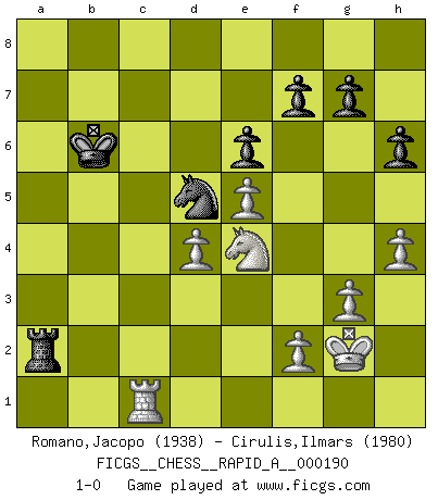 Last move : 1-0 2016 August 8 23:43:12 [Event "FICGS__CHESS__RAPID_A__000190"] [Site "FICGS"] [Date "2016.06.23"] [Round "1"] [White "Romano,Jacopo"] [Black "Cirulis,Ilmars"] [Result "1-0"] [WhiteElo "1938"] [BlackElo "1980"] 1.d4 a6 2.e4 e6 3.Nf3 d5 4.Nbd2 Nf6 5.Bd3 c5 6.c3 c4 7.Bc2 b5 8.e5 Nfd7 9.Nf1 Be7 10.Ng3 b4 11.h4 h6 12.Nh5 Bf8 13.Ba4 Bb7 14.cxb4 Bc6 15.a3 Bxa4 16.Qxa4 Qb6 17.O-O Nc6 18.Be3 Qb5 19.Qc2 Nb6 20.b3 cxb3 21.Qxb3 Nc4 22.Qd3 Nb6 23.Qc2 Qa4 24.Qxa4 Nxa4 25.g3 Kd7 26.Kg2 Be7 27.Rfc1 Rac8 28.Nd2 Rhg8 29.Nf4 Ra8 30.Rab1 Rgb8 31.Nh5 Bf8 32.Rc2 a5 33.Rbc1 Ne7 34.bxa5 Rxa5 35.Nf6+ Kd8 36.Nf3 Nb6 37.Bd2 Rxa3 38.Bb4 R3a8 39.Bd6 Rc8 40.Bc7+ Rxc7 41.Rxc7 Nc4 42.R7xc4 dxc4 43.Nh7 Kd7 44.Rxc4 Nd5 45.Nxf8+ Rxf8 46.Nd2 Ra8 47.Ne4 Ra2 48.Nc5+ Kc6 49.Rc1 Kb6 50.Ne4 1-0 Queen's pawn Kingside Castling by player White (move 17) Player White won this chess game. Follow this game move after move (download)Chess is a cold bath for the mind. (Sir John Simon) Kleine Schachspieler machen Mist, und große Schachspieler machen Mist, aber große machen weniger Mist. (Fritz Sämisch) El Ajedrez es el juego mas altamente simbólico, pero las agresiones estan por lo tanto aún mas francamente representadas en la partida. Tal vez comenzo como un juego de guerra; Algo como la representación de una batalla en miniatura entre las fuerzas de dos reinos. (Karl Meninger) Dans le domaine de la peinture, de la gravure et de la sculpture, dès la première décennie de notre siècle, les artistes abandonnent la représentation de la partie d'échecs pour se concentrer sur les pièces, sur les échiquiers et sur toutes les variations auxquelles les unes et les autres peuvent donner lieu. On passe en quelque sorte d'un thème social à un thème musical (au sens de la musica médiévale, c'est-à-dire d'une notion qui inclue le rythme, l'harmonie, la construction et la déconstruction, etc.). Graphiquement et picturalement, l'échiquier apparaît comme une structure ouverte, dynamique, d'une richesse infinie, autorisant toutes les combinatoires et débouchant sur des mouvements et des rythmes de nature exponentielle. (Michel Pastoureau) Man is still the most extraordinary computer of all. (John F. Kennedy)