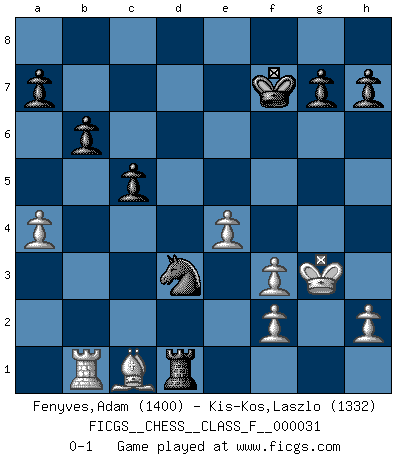 Last move : 0-1 2007 May 17 0:21:39 [Event "FICGS__CHESS__CLASS_F__000031"] [Site "FICGS"] [Date "2007.03.26"] [Round "1"] [White "Fenyves,Adam"] [Black "Kis-Kos,Laszlo"] [Result "0-1"] [WhiteElo "1400"] [BlackElo "1332"] 1.e4 e5 2.d4 exd4 3.c3 dxc3 4.Bc4 cxb2 5.Bxb2 d5 6.Bxd5 Nf6 7.Bxf7+ Kxf7 8.Qxd8 Bb4+ 9.Qd2 Bxd2+ 10.Nxd2 Nc6 11.Ngf3 Bg4 12.O-O Bxf3 13.gxf3 Rad8 14.Nc4 Rd7 15.Ne5+ Nxe5 16.Bxe5 Rhd8 17.Rab1 b6 18.Rfc1 c5 19.Kg2 Rd2 20.Rb2 Rxb2 21.Bxb2 Rd2 22.Rb1 Nh5 23.a4 Nf4+ 24.Kg3 Nd3 25.Bc1 Rd1 0-1 Danish gambit : Schlechter defense Kingside Castling by player White (move 12) Player Black won this chess game. Follow this game move after move (download)You cannot play at Chess if you are kind-hearted. (French Proverb) Ich liebe den Moment, wenn ich das Ego meines Gegenüber breche. (Robert James Fischer) El Ajedrez es de 30 a 40 por ciento psicología. Uno no cuenta con esto cuando se juega contra una computadora. No lo puedo confundir. (Judith Polgar) Vous m'avez demandé de vous exposer quel est le fondement de la prière. Je ne fais que préparer les pièces du jeu sur la table... Nous sera-t-il permis d'en adopter les règles et si nous les appliquons scrupuleusement nous ne tarderons pas à faire mat le Roi divin ! Il ne pourra échapper à nos mains. (Sainte Thérèse d'Avila, Chemin de perfection) If passion drives you, let reason holds the reins. (Benjamin Franklin)