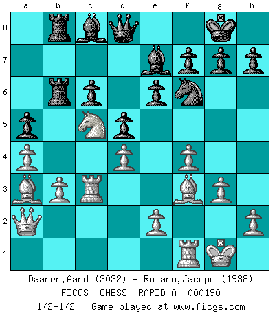 Last move : 1/2-1/2 2016 July 31 20:35:13 [Event "FICGS__CHESS__RAPID_A__000190"] [Site "FICGS"] [Date "2016.06.23"] [Round "1"] [White "Daanen,Aard"] [Black "Romano,Jacopo"] [Result "1/2-1/2"] [WhiteElo "2022"] [BlackElo "1938"] 1.d4 Nf6 2.c4 e6 3.Nf3 b6 4.g3 Ba6 5.b3 b5 6.cxb5 Bxb5 7.Bg2 d5 8.O-O Nbd7 9.Nc3 Ba6 10.Ne5 c6 11.Nd3 Rc8 12.Bb2 Be7 13.Na4 Bb5 14.Nac5 Ra8 15.f3 O-O 16.Qc2 Qc7 17.Rac1 Nxc5 18.Nxc5 a5 19.a4 Ba6 20.Ba3 Rfb8 21.f4 Rb6 22.Qa2 Bc8 23.Bf3 Rab8 24.Rc3 Qd8 1/2-1/2 Queen's Indian : Nimzovich variation (exaggerated Fianchetto) Kingside Castling by player White (move 8) Kingside Castling by player Black (move 15) This chess game ended in a draw. Follow this game move after move (download)I believe that Chess possesses a magic that is also a help in advanced age. A rheumatic knee is forgotten during a game of Chess and other events can seem quite unimportant in comparison with a catastrophe on the chessboard. (Vlastimil Hort) Früher wurde jeder komplizierte Zug, jedes interessante Opfer mit großem Beifall und Enthusiasmus aufgenommen. Heute schaltet man einfach seinen Fritz an, und man kann sehen, was los ist, ob der Zug geht oder nicht. (Vladimir Kramnik) Uno por uno, yo los acribillé, mi superioridad muy pronto se volvio aparente. (Jose Capablanca) 'L'échange des dames est un coup dur pour les deux adversaires...' Un journaliste lors d'une partie du match Spassky-Fischer It's only after you lost everything, Tyler says, that you're free to do anything. (Chuck Palahniuk, Fight Club)