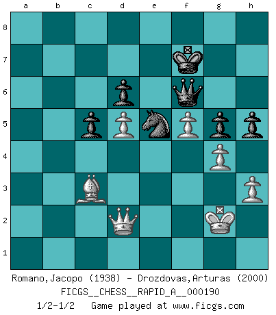 Last move : 1/2-1/2 2016 August 12 18:41:43 [Event "FICGS__CHESS__RAPID_A__000190"] [Site "FICGS"] [Date "2016.06.23"] [Round "1"] [White "Romano,Jacopo"] [Black "Drozdovas,Arturas"] [Result "1/2-1/2"] [WhiteElo "1938"] [BlackElo "2000"] 1.d4 Nf6 2.c4 e6 3.g3 c5 4.d5 exd5 5.cxd5 d6 6.Bg2 g6 7.Nc3 Bg7 8.Nf3 O-O 9.O-O a6 10.a4 Re8 11.Nd2 Nbd7 12.h3 Rb8 13.Nc4 Ne5 14.Na3 Nh5 15.e4 Rf8 16.Kh2 f5 17.f4 b5 18.axb5 axb5 19.Naxb5 fxe4 20.Bxe4 Bd7 21.Qe2 Nf7 22.Ra7 Nf6 23.Bd3 Rb6 24.g4 Qb8 25.Ra5 Re8 26.Qg2 Rb7 27.Rg1 Qd8 28.Ra2 Ne4 29.Re1 Nxc3 30.Rxe8+ Qxe8 31.Nxc3 Bd4 32.Qe2 Qb8 33.Qc2 Rb4 34.Ne2 Bb5 35.Nxd4 Bxd3 36.Qxd3 Rxd4 37.Qe3 Rb4 38.Bd2 Rxb2 39.Rxb2 Qxb2 40.Kg3 g5 41.f5 Qf6 42.Bc3 Ne5 43.Kf2 Kf7 44.Qd2 h5 45.Kg2 1/2-1/2 Catalan Opening Kingside Castling by player Black (move 8) Kingside Castling by player White (move 9) This chess game ended in a draw. Follow this game move after move (download)Spassky will not be psyched out by Fischer. (Mike Goodall) Wenn ich Weiß habe gewinne ich weil ich Weiß habe, wenn ich Schwarz habe gewinne ich weil ich Bogoljubov bin. (Efim Bogoljubov) Fischer es el jugador mas fuerte del mundo. De hecho, el jugador mas fuerte que jamas haya existido. (Larry Evans) J'ai toujours senti une vague pitié pour l'homme qui ne connaît rien aux échecs, tout comme j'en aurais pour un homme ignorant de l'amour. Les Echecs, comme la musique ou comme l'amour, ont le pouvoir de rendre heureux. (Siegbert Tarrasch) The leaves of memory seemed to make a mournful rustling in the dark. (Henry Wadsworth Longfellow)