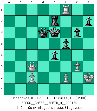 Last move : 1-0 2016 July 23 17:48:15 [Event "FICGS__CHESS__RAPID_A__000190"] [Site "FICGS"] [Date "2016.06.23"] [Round "1"] [White "Drozdovas,Arturas"] [Black "Cirulis,Ilmars"] [Result "1-0"] [WhiteElo "2000"] [BlackElo "1980"] 1.e4 a6 2.d4 e6 3.Nf3 d5 4.Nc3 Nf6 5.Bd3 c5 6.exd5 exd5 7.O-O c4 8.Re1+ Be7 9.Be2 O-O 10.Ne5 Re8 11.b3 cxb3 12.axb3 Be6 13.Na4 Nbd7 14.Nxd7 Bxd7 15.Nc5 Bc6 16.Nd3 Bd6 17.Bb2 Ne4 18.Bh5 a5 19.Ne5 g6 20.Bf3 a4 21.Bxe4 dxe4 22.Nxc6 bxc6 23.Rxa4 Bxh2+ 24.Kxh2 Rxa4 25.bxa4 Qb8+ 26.g3 Qxb2 27.Qd2 f5 28.d5 cxd5 29.Qxd5+ Kf8 30.Qd2 Qe5 31.a5 Re7 32.a6 Qf6 33.Qh6+ Ke8 34.Rb1 Qxa6 35.Rb8+ Kd7 36.Qe3 Qd6 37.Rf8 Ke6 38.Qc3 1-0 St. George (Baker) defense Kingside Castling by player White (move 7) Kingside Castling by player Black (move 9) Player White won this chess game. Follow this game move after move (download)The boy (then a 12 year old boy named Anatoly Karpov) doesn't have a clue about Chess, and there's no future at all for him in this profession. (Mikhail Botvinnik) Bis jetzt ist Weiß einer wohlbekannten Analyse gefolgt. Aber jetzt begeht er einen schrecklichen Fehler: Er beginnt seinen eigenen Kopf zu benutzen. (Siegbert Tarrasch) Al jugar al Ajedrez entonces, podemos aprender: Primero: Previsión... Segundo: Prudencia... Tercero: Cautela... Y al final, aprendemos del Ajedrez el hábito de no ser desanimados por apariencias malas presentes en el estado de nuestros asuntos, el hábito de la esperanza por una oportunidad favorable y la perseveración de los secretos de los recursos. (Benjamin Franklin) Le succès, c'est être capable d'aller d'échec en échec sans perdre son enthousiasme. (Winston Churchill) I find your interest interesting. (Gregory House, House M.D.)