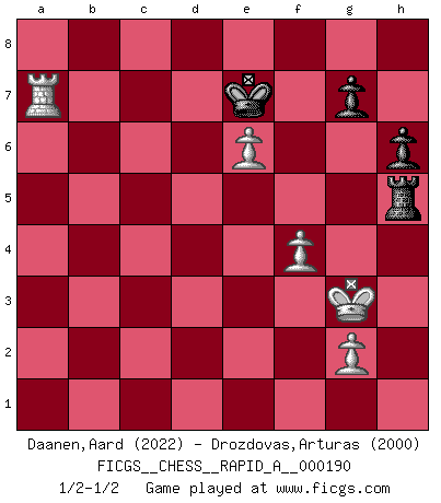Last move : 1/2-1/2 2016 July 23 15:0:15 [Event "FICGS__CHESS__RAPID_A__000190"] [Site "FICGS"] [Date "2016.06.23"] [Round "1"] [White "Daanen,Aard"] [Black "Drozdovas,Arturas"] [Result "1/2-1/2"] [WhiteElo "2022"] [BlackElo "2000"] 1.e4 e5 2.Nf3 Nc6 3.Bc4 Bc5 4.c3 Nf6 5.d3 d6 6.O-O O-O 7.a4 a6 8.Re1 a5 9.h3 h6 10.Nbd2 Bd7 11.Nf1 Be6 12.b3 Re8 13.Bb5 d5 14.Qc2 Nd7 15.Ng3 Qf6 16.d4 exd4 17.Bxc6 d3 18.Qxd3 bxc6 19.e5 Qg6 20.Qxg6 fxg6 21.Nd4 Rab8 22.Bd2 Nf8 23.Nge2 Bd7 24.Nf4 g5 25.e6 gxf4 26.exd7 Rxe1+ 27.Rxe1 Nxd7 28.Bxf4 Bxd4 29.cxd4 Rxb3 30.Re7 Nf6 31.Rxc7 Ra3 32.Be5 Rxa4 33.Rxc6 Nd7 34.Rc8+ Kh7 35.Rd8 Nxe5 36.dxe5 Ra1+ 37.Kh2 Ra2 38.Kg3 Kg6 39.Rxd5 Kf5 40.h4 a4 41.Ra5 Ra3+ 42.f3 Ra1 43.h5 a3 44.f4 a2 45.e6 Kf6 46.Re5 Ke7 47.Re2 Rh1 48.Rxa2 Rxh5 49.Ra7+ 1/2-1/2 Giuoco Piano Kingside Castling by player White (move 6) Kingside Castling by player Black (move 6) 10 pieces endgame at move 48 : White KRPPPP , Black KRPP WHITE : King + 1 Rook 4 Pawns BLACK : King + 1 Rook 2 Pawns 9 pieces endgame at move 48 : White KRPPP , Black KRPP WHITE : King + 1 Rook 3 Pawns BLACK : King + 1 Rook 2 Pawns This chess game ended in a draw. Follow this game move after move (download)Chess is so inspiring that I do not believe a good player is capable of having an evil thought during the game. (Wilhelm Steinitz) Der Knackpunkt bei der Konzentration ist, daß wir nur durch sie etwas Neues und Ungewöhnliches am Schachbrett finden können. Sie ist der einzige Weg durch neue neue Ideen eine Überraschung zu bereiten. (Garry Kasparov) El Ajedrez te enseña a controlarl la excitación inicial que sientes cuando vez algo que parece bueno y te enseña a pensar objetivamente cuando te encuentras en problemas. (Stanley Kubrick) La victoire dans une partie d'Echecs appartient la plupart du temps à celui qui voit un peu plus loin que l'adversaire. (Lasker) For a mechanic, you seem to do an excessive amount of thinking. (C-3PO in Star Wars ep.2)