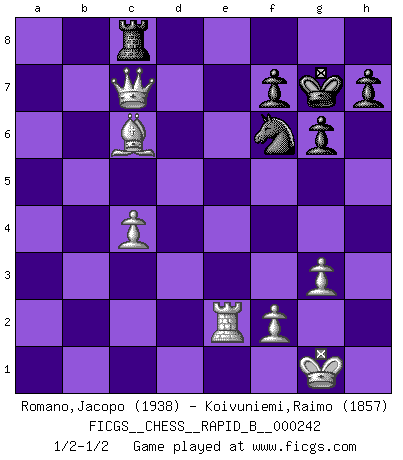 Last move : 1/2-1/2 2016 September 21 17:34:30 [Event "FICGS__CHESS__RAPID_B__000242"] [Site "FICGS"] [Date "2016.06.24"] [Round "1"] [White "Romano,Jacopo"] [Black "Koivuniemi,Raimo"] [Result "1/2-1/2"] [WhiteElo "1938"] [BlackElo "1857"] 1.d4 Nf6 2.c4 d6 3.Nf3 g6 4.g3 Bg7 5.Bg2 O-O 6.O-O Nc6 7.Nc3 a6 8.Qd3 Bd7 9.d5 Nb4 10.Qd1 a5 11.a3 Na6 12.Be3 c6 13.Bd4 e5 14.dxe6 Bxe6 15.b3 Nc5 16.Rc1 Re8 17.Ng5 Bh6 18.h4 Bg4 19.b4 axb4 20.axb4 Ne6 21.b5 Nxd4 22.Qxd4 Rc8 23.bxc6 bxc6 24.Rfd1 Bxe2 25.Re1 Bh5 26.Rxe8+ Nxe8 27.Re1 Bxg5 28.hxg5 Qxg5 29.Bxc6 Nf6 30.Qxd6 Kg7 31.Nb5 Bg4 32.Nc7 Qa5 33.Re7 Be2 34.Rxe2 Qxc7 35.Qxc7 1/2-1/2 Old Indian defense Kingside Castling by player Black (move 5) Kingside Castling by player White (move 6) This chess game ended in a draw. Follow this game move after move (download)White lost because he failed to remember the right continuation and had to think up the moves himself. (Siegbert Tarrasch) Jeder leidlich begabte Spieler, er braucht keineswegs hervorragend veranlagt zu sein, kann es zum Meister bringen. Aber das ist ja auch gar nicht nötig! Der richtige Standpunkt ist es, zu seinem Vergnügen zu spielen, und man glaube ja nicht, dass der Genuss proportional dem Können sei. (Siegbert Tarrasch) Una mala movida nulifica cuarenta buenas. (Horowitz) Vous m'avez demandé de vous exposer quel est le fondement de la prière. Je ne fais que préparer les pièces du jeu sur la table... Nous sera-t-il permis d'en adopter les règles et si nous les appliquons scrupuleusement nous ne tarderons pas à faire mat le Roi divin ! Il ne pourra échapper à nos mains. (Sainte Thérèse d'Avila, Chemin de perfection) A clear conscience is usually the sign of a bad memory. (Unknown)