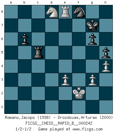 Last move : 1/2-1/2 2016 August 15 12:27:24 [Event "FICGS__CHESS__RAPID_B__000242"] [Site "FICGS"] [Date "2016.06.24"] [Round "1"] [White "Romano,Jacopo"] [Black "Drozdovas,Arturas"] [Result "1/2-1/2"] [WhiteElo "1938"] [BlackElo "2000"] 1.d4 Nf6 2.c4 e6 3.g3 d5 4.Nf3 Bb4+ 5.Bd2 Be7 6.Bg2 O-O 7.O-O c6 8.Qc2 b6 9.Rd1 Ba6 10.b3 Nbd7 11.a4 Qc8 12.Na3 c5 13.Qb2 Ne4 14.Be1 Qb7 15.e3 Rac8 16.Rac1 Rfd8 17.Nb5 f5 18.b4 dxc4 19.Rxc4 cxb4 20.Rxc8 Rxc8 21.Bxb4 Bxb4 22.Qxb4 Bxb5 23.axb5 Qc7 24.Rf1 h6 25.Qa3 Kh7 26.h3 Nc3 27.Qe7 Nf8 28.Qb4 Qc4 29.Qxc4 Rxc4 30.Ne5 Rb4 31.Ra1 Ng6 32.Nc6 Rxb5 33.Bf1 Rb2 34.Rxa7 Ne4 35.h4 h5 36.Nd8 Nf8 37.d5 exd5 38.Rf7 Kg8 39.Rxf5 g6 40.Rxd5 Nxf2 41.Re5 Rc2 42.Bc4+ Rxc4 43.Kxf2 Rc5 44.Re8 Kg7 1/2-1/2 Catalan Opening Kingside Castling by player Black (move 6) Kingside Castling by player White (move 7) This chess game ended in a draw. Follow this game move after move (download)Capture of the adverse King is the ultimate but not the first object of the game. (William Steinitz) Jede Eröffnung ist gut genug um gespielt zu werden, wenn nur ihr Ruf schlecht genug ist. (Savielly Grigorievitsch Tartakower) Yo he agregado estos principios a la ley: pongan los Caballos en acción antes de que los dos Alfiles sean desarrollados. (Emanuel Lasker) RxDa4 pat (...) A married woman is like a fish riding a bicycle. (Rodolfo d'Ettorre)