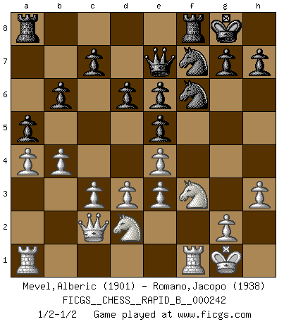 Last move : 1/2-1/2 2016 August 16 21:17:53 [Event "FICGS__CHESS__RAPID_B__000242"] [Site "FICGS"] [Date "2016.06.24"] [Round "1"] [White "Mevel,Alberic"] [Black "Romano,Jacopo"] [Result "1/2-1/2"] [WhiteElo "1901"] [BlackElo "1938"] 1.e4 e5 2.Nf3 Nc6 3.Bc4 Bc5 4.O-O Nf6 5.d3 O-O 6.Nbd2 d6 7.c3 a5 8.a4 Ba7 9.h3 Be6 10.Bxe6 fxe6 11.Nc4 Qe8 12.Be3 Bxe3 13.fxe3 b6 14.Ncd2 Nd8 15.Qc2 Nf7 16.b4 Qe7 1/2-1/2 Giuoco Piano Kingside Castling by player White (move 4) Kingside Castling by player Black (move 5) This chess game ended in a draw. Follow this game move after move (download)War is the child of passion, passion is the child of narcissism and narcissism is the child. (...) Another game ? (Thibault de Vassal) Ich bin der einzige Schachspieler, der sich während der Vorbereitungen zum Turnier verletzt hat. (Woody Allen) El Ajedrez es el juego mas altamente simbólico, pero las agresiones estan por lo tanto aún mas francamente representadas en la partida. Tal vez comenzo como un juego de guerra; Algo como la representación de una batalla en miniatura entre las fuerzas de dos reinos. (Karl Meninger) La guerre est enfant de la passion, la passion est enfant du narcissisme et le narcissisme est l'enfant. (...) Une autre partie ? (Thibault de Vassal) Lamb in skin of tiger, still fears the wolf. (Chinese proverb)