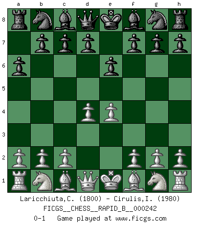 Last move : 0-1 2016 July 26 16:4:52 [Event "FICGS__CHESS__RAPID_B__000242"] [Site "FICGS"] [Date "2016.06.24"] [Round "1"] [White "Laricchiuta,Claudio"] [Black "Cirulis,Ilmars"] [Result "0-1"] [WhiteElo "1800"] [BlackElo "1980"] 1.e4 a6 2.d4 e6 0-1 This chess game has been lost on time (started : 2016.06.24 1:19:13) St. George (Baker) defense Player Black won this chess game. Follow this game move after move (download)If cunning alone were needed to excel, women would be the best Chess players. (Albin) Zeige mir drei Eröffnungsvarianten und ich beweise dir, dass zwei davon inkorrekt sind. (Emanuel Lasker) Debió haber existido una vez en que los hombres eran semidióses, de otra manera no hubiesen podido inventar el Ajedrez. (Gustav Schenk) Assurément je connaissais par expérience le mystérieux attrait de ce jeu royal, le seul entre tous les jeux inventés par les hommes qui échappe souverainement à la tyrannie du hasard, le seul où l'on ne doive sa victoire qu'à son intelligence ou plutôt à une certaine forme d'intelligence. Mais n'est-ce pas déjà le limiter injurieusement que d'appeler les échecs un jeu ? N'est-ce pas une science, un art ou quelque chose qui, comme le cercueil de Mahomet entre ciel et terre, est suspendu entre l'un et l'autre, et qui réunit un nombre incroyable de contraires ? [...] C'est une pensée qui ne mène à rien, une mathématique qui n'établit rien, un art qui ne laisse pas d'uvre, une architecture sans matière; et il l'a prouvé néanmoins qu'il était plus durable, à sa manière, que les livres ou que tout autre monument, ce jeu unique qui appartient à tous les peuples et à tous les temps, et dont personne ne sait quel dieu en fit don à la terre pour tuer l'ennui, pour aiguiser l'esprit et stimuler l'âme. Où commence-t-il, où finit-il ? (Stefan Zweig) May the force be with you. (Han Solo in Star Wars ep.4)