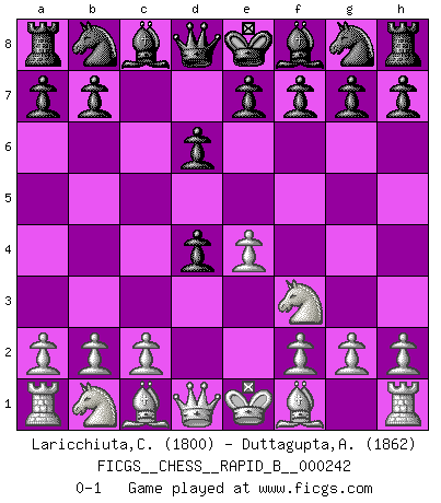 Last move : 0-1 2016 July 27 16:6:30 [Event "FICGS__CHESS__RAPID_B__000242"] [Site "FICGS"] [Date "2016.06.24"] [Round "1"] [White "Laricchiuta,Claudio"] [Black "Duttagupta,Aniruddha"] [Result "0-1"] [WhiteElo "1800"] [BlackElo "1862"] 1.e4 c5 2.Nf3 d6 3.d4 cxd4 0-1 This chess game has been lost on time (started : 2016.06.24 1:19:13) Sicilian Player Black won this chess game. Follow this game move after move (download)I played Chess with him and would have beaten him sometimes only he always took back his last move, and ran the game out differently. (Mark Twain) Wie gewinnt Tal? Er entwickelt alle seine Figuren in die Brettmitte und opfert sie dann irgendwo. (Robert James Fischer) Un sacrificio se refuta mucho mejor al aceptarlo. (Wilhelm Steinitz) Lorsque vous vous retrouvez devant une position atroce, ne tendez pas un ultime piège dérisoire avec l'intention d'abandonner si l'adversaire le déjoue ! Faites-vous plutôt un devoir de résister comme si votre vie en dépendait. Jouez le coup qui vous déplairait au centuple si vous étiez dans la peau de votre tortionnaire ! There are two kinds of people in the world, my friend. Those who have a loaded gun and those who dig. You dig ! (Blondie in The Good, The Bad and The Ugly)