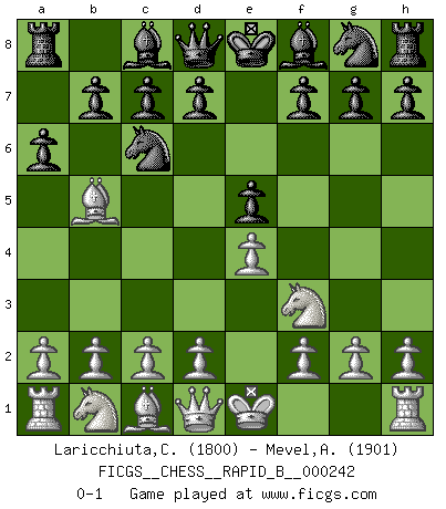 Last move : 0-1 2016 July 28 4:16:32 [Event "FICGS__CHESS__RAPID_B__000242"] [Site "FICGS"] [Date "2016.06.24"] [Round "1"] [White "Laricchiuta,Claudio"] [Black "Mevel,Alberic"] [Result "0-1"] [WhiteElo "1800"] [BlackElo "1901"] 1.e4 e5 2.Nf3 Nc6 3.Bb5 a6 0-1 This chess game has been lost on time (started : 2016.06.24 1:19:13) Ruy Lopez (Spanish Opening) Player Black won this chess game. Follow this game move after move (download)It is not enough to be a good player... you must also play well. (Siegbert Tarrasch) Ich kenne keine einzige Person, die behaupten würde, Garri Kasparow sei ein guter Mensch (Nigel Short) La captura del Rey enemigo es la finalidad pero no el primer objetivo de la partida. (William Steinitz) Il vaut toujours mieux jouer un plan faux de façon logique que de n'avoir pas de plan du tout. (Victor Kortchnoï) The absolute truth is the thing that makes people laugh. (Carl Reiner)
