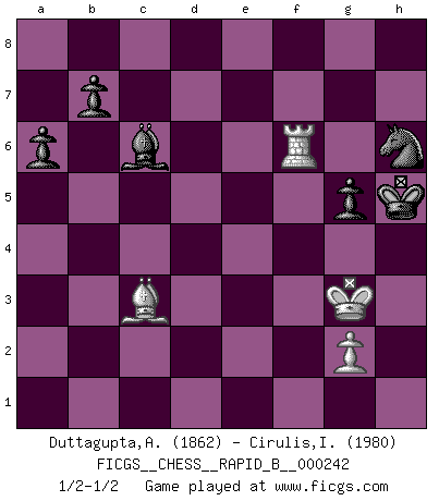 Last move : 1/2-1/2 2016 August 11 20:4:47 [Event "FICGS__CHESS__RAPID_B__000242"] [Site "FICGS"] [Date "2016.06.24"] [Round "1"] [White "Duttagupta,Aniruddha"] [Black "Cirulis,Ilmars"] [Result "1/2-1/2"] [WhiteElo "1862"] [BlackElo "1980"] 1.c4 a6 2.a3 e5 3.Nc3 Nc6 4.Nf3 Nge7 5.d4 exd4 6.Nxd4 d6 7.e4 Nxd4 8.Qxd4 Nc6 9.Qd3 g6 10.h4 Bg7 11.Bg5 f6 12.Be3 Be6 13.h5 Ne5 14.Qc2 f5 15.O-O-O O-O 16.hxg6 hxg6 17.exf5 Bxf5 18.Qb3 Qe7 19.c5 Qf7 20.Qxf7+ Rxf7 21.cxd6 cxd6 22.Rxd6 Rc8 23.Be2 Rfc7 24.Bb6 Rxc3+ 25.bxc3 Rxc3+ 26.Kd2 Nf7 27.Rd5 Rc2+ 28.Ke3 Rc3+ 29.Kf4 Rxa3 30.f3 Be6 31.Rd3 Ra2 32.Ke3 Bh6+ 33.f4 Bxf4+ 34.Kxf4 Rxe2 35.Re3 g5+ 36.Kg3 Rxe3+ 37.Bxe3 Kg7 38.Rb1 Bd5 39.Bd4+ Kg6 40.Rf1 Nh6 41.Rf6+ Kh5 42.Bc3 Bc6 1/2-1/2 English Opening Queenside Castling by player White (move 15) Kingside Castling by player Black (move 15) 10 pieces endgame at move 37 : White KRBP , Black KBNPPP WHITE : King + 1 Rook 1 Bishop 1 Pawn BLACK : King + 1 Bishop 1 Knight 3 Pawns This chess game ended in a draw. Follow this game move after move (download)A great player and a great example for many. His book My 60 Memorable Games had a big impact on me. It is a shame he didn't continue to enrich the world of chess with his unparalleled understanding after 1972. (Jan Timman, about Bobby Fischer's death) Schach ist ein Teil der Kultur, und wenn es mit der Kultur abwärts geht, geht es auch mit dem Schach abwärts. (Mikhail Moiseyevich Botvinik) Dejen al perfeccionista jugar por correo. (Yasser Seirawan) Les échecs, c'est l'imagination. (David Bronstein) Home computers are being called upon to perform many new functions, including the consumption of homework formerly eaten by the dog. (Doug Larson)
