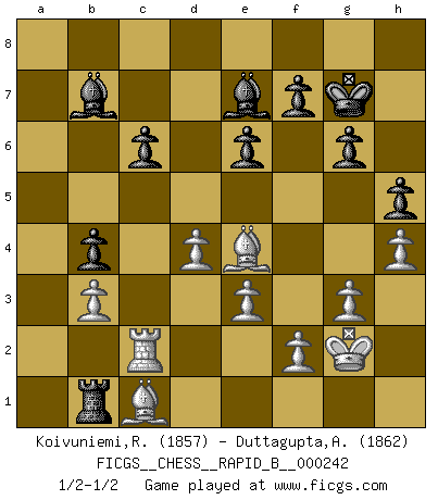 Last move : 1/2-1/2 2016 October 1 12:53:12 [Event "FICGS__CHESS__RAPID_B__000242"] [Site "FICGS"] [Date "2016.06.24"] [Round "1"] [White "Koivuniemi,Raimo"] [Black "Duttagupta,Aniruddha"] [Result "1/2-1/2"] [WhiteElo "1857"] [BlackElo "1862"] 1.d4 d5 2.c4 c6 3.Nc3 e6 4.e3 Nf6 5.Nf3 Nbd7 6.Qc2 Bd6 7.Bd2 O-O 8.Bd3 dxc4 9.Bxc4 b5 10.Bd3 Bb7 11.Ng5 h6 12.Nge4 Be7 13.Nxf6+ Nxf6 14.Ne4 Nxe4 15.Bxe4 b4 16.a3 a5 17.O-O Qb6 18.axb4 axb4 19.Rxa8 Rxa8 20.Rc1 Rc8 21.Qa4 g6 22.g3 Kg7 23.Rc4 Ra8 24.Qd1 Qb5 25.b3 Ra2 26.h4 h5 27.Qe1 Qa6 28.Bc1 Ra1 29.Qd2 Qa2 30.Qc2 Qxc2 31.Rxc2 Rb1 32.Kg2 1/2-1/2 QGD Slav defense Kingside Castling by player Black (move 7) Kingside Castling by player White (move 17) This chess game ended in a draw. Follow this game move after move (download)You may learn much more from a game you lose than from a game you win. You will have to lose hundreds of games before becoming a good player. (Jose Raul Capablanca) Ich kenne Menschen, die allen Willen der Welt besitzen und doch nicht Schach spielen können. (Robert James Fischer) Mis oponentes también hacen buenas movidas. A veces yo no tomo esas cosas en consideración. (Bobby Fischer) Comme les marins qui ont mille raisons différentes d'aller en mer, les joueurs d'échecs en ont tout autant avant de s'installer devant une table et jouer... (Vincent Bertignac, philosophe) I take risks, sometimes patients die, but not taking risks causes more patients to die. So I guess my biggest problem is I've been cursed with the ability to do the math. (Gregory House, House M.D.)