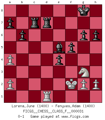 Last move : 0-1 2007 May 18 2:6:59 [Event "FICGS__CHESS__CLASS_F__000031"] [Site "FICGS"] [Date "2007.03.26"] [Round "1"] [White "Lorena,June"] [Black "Fenyves,Adam"] [Result "0-1"] [WhiteElo "1400"] [BlackElo "1400"] 1.d4 Nf6 2.Nc3 g6 3.f3 Bg7 4.e4 d6 5.Bd3 O-O 6.Nge2 e5 7.Be3 Be6 8.O-O h6 9.d5 Bd7 10.f4 c6 11.fxe5 dxe5 12.dxc6 Nxc6 13.Qe1 b6 14.Nd5 Nxd5 15.exd5 Ne7 16.Qh4 Nf5 17.Qxd8 Rfxd8 18.Rae1 Nxe3 19.Rf3 Nf5 20.Bxf5 Bxf5 21.Ng3 Bxc2 22.Ref1 f5 23.Rc3 Ba4 24.b3 e4 25.bxa4 Bxc3 26.Rd1 Rac8 27.d6 Be5 28.d7 Rc7 29.Kf2 R8xd7 0-1 Queen's pawn game Kingside Castling by player Black (move 5) Kingside Castling by player White (move 8) Player Black won this chess game. Follow this game move after move (download)One bad move nullifies forty good ones. (Horowitz) Frage des Reporters: -Welche besonderen Umstände rechtfertigen das Anhalten der Uhren während einer Turnierpartie? Antwort: -Einen Fotographen zu strangulieren. (Siegbert Tarrasch) Un jugador que es sorprendido, esta derrotado a medias. (Proverbio) Toutes les manuvres exécutées sur une colonne ouverte ont pour but ultime l'intrusion définitive sur la septième ou la huitième rangée, en plein cur de la position ennemie. (Aaron Nimzovitch) You can't play chess if you're groggy from pills. (Anatoly Karpov)