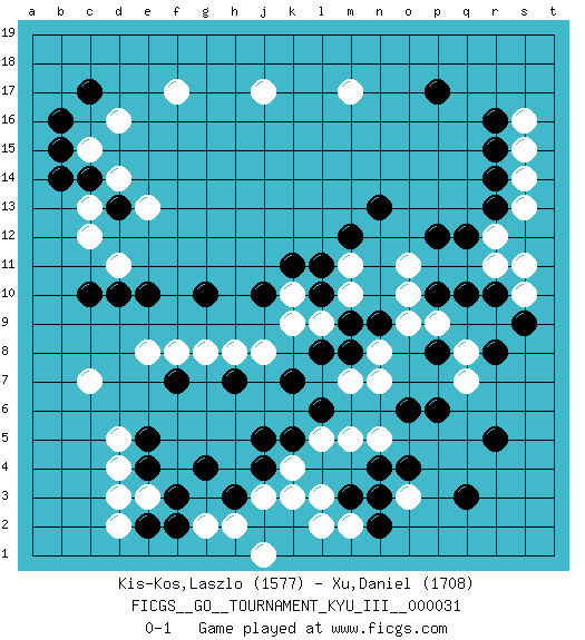 Last move : 0-1 2016 November 2 14:9:22 [Event "FICGS__GO__TOURNAMENT_KYU_III__000031"] [Site "FICGS"] [Date "2016.06.25"] [Round "1"] [Black "Kis-Kos,Laszlo"] [White "Xu,Daniel"] [Result "0-1"] [Rating 1 "1577"] [Rating 2 "1708"] 1.r16 d4 2.q3 d16 3.p17 j17 4.r5 k3 5.c10 c7 6.c14 f17 7.b16 c12 8.c17 c15 9.b15 d14 10.d13 c13 11.b14 e13 12.e10 d11 13.d10 e8 14.g10 g8 15.j10 e3 16.q10 r12 17.p12 s16 18.r15 s15 19.r14 s14 20.r13 s13 21.q12 r11 22.r10 s10 23.s9 s11 24.j4 j3 25.g4 k4 26.j5 j8 27.k5 l5 28.l6 m5 29.k7 k9 30.l11 m17 31.h3 o3 32.n4 m2 33.m3 l3 34.n2 l2 35.n3 n5 36.o4 n7 37.m8 n8 38.m9 q8 39.r8 q7 40.p6 o10 41.p10 o11 42.n13 k10 43.k11 m10 44.l10 m11 45.m12 l9 46.n9 o9 47.f7 f8 48.e5 d5 49.f3 g2 50.f2 h2 51.e2 d2 52.e4 d3 53.h7 h8 54.p8 p9 55.o6 m7 56.l8 j1 0-1 This go game has been lost on time (started : 2016.06.25 2:6:15) Here are the names of the openings (joseki) played in the four corners : Player White won this Go (weiqi, baduk) game. Follow this game move after move (download)Eyes win semiais. (Anonymous) The ego is not master in its own house. (Sigmund Freud)