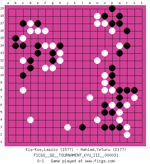 Last move : 0-1 2016 November 2 2:7:21 [Event "FICGS__GO__TOURNAMENT_KYU_III__000031"] [Site "FICGS"] [Date "2016.06.25"] [Round "1"] [Black "Kis-Kos,Laszlo"] [White "Aahlad,Yeturu"] [Result "0-1"] [Rating 1 "1577"] [Rating 2 "2177"] 1.r16 d16 2.q3 d4 3.p17 q5 4.q8 n4 5.p5 p6 6.o5 q4 7.o3 r3 8.p3 p8 9.p9 o8 10.r8 o9 11.p10 o10 12.p11 n12 13.q6 r6 14.q7 r2 15.l3 j3 16.o6 o13 17.q13 m7 18.c10 c8 19.c14 c12 20.e14 f16 21.d11 c15 22.b14 g14 23.d12 n17 24.e17 e16 25.c17 d17 26.b15 p18 27.o18 o17 28.q18 p16 29.q17 n18 30.p19 q14 31.r14 s7 32.s8 g11 33.g13 h13 34.g12 h12 35.h14 f14 36.e13 f11 0-1 This go game has been lost on time (started : 2016.06.25 2:6:15) Here are the names of the openings (joseki) played in the four corners : Corner q4 : q3 q5 Komoku (Somok, Xiao~mu`) 3-4 Point. The komoku (3-4) point is the traditional corner enclosure move.. Ikken Takagakari (Hankan Nop'dakeolch'im, Yi Gaogua`jiao~, 1-Space High Approach). The 5-4 approach move has become more popular in modern times, as modern Go emphasizes speed and influence. Corner d16 : d16 c14 Hoshi (Hwajeom, Seongjeom, Xingwei`) 4-4 Point. The star or hoshi (4-4) point, emphasizing influence at the potential expense of territory. Ikken Kakari (Hankan Keolch'im, Yi Gua`jiao~, 1-Space Low Approach). Black 2 is the standard approach move to the 4-4. Player White won this Go (weiqi, baduk) game. Follow this game move after move (download)A basic: Don't push too hard. (Jansteen) In fact if nothing is done against this teddy bear, hereby I announce that I would quit chess, rapid chess, blitz chess, postal chess, email chess, server chess and correspondence chess I will then switch to a table game where teddy bears aren't going to be seen for a while, like Poker, or Roulette, all 18+ games. (Elmer Valderrama)