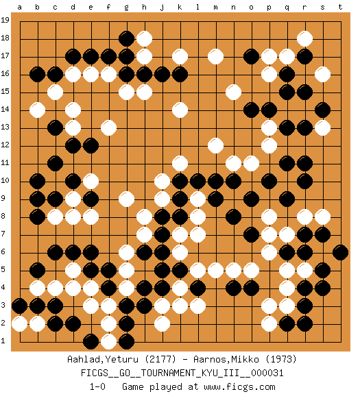 Last move : 1-0 2017 February 12 4:38:18 [Event "FICGS__GO__TOURNAMENT_KYU_III__000031"] [Site "FICGS"] [Date "2016.06.25"] [Round "1"] [Black "Aahlad,Yeturu"] [White "Aarnos,Mikko"] [Result "1-0"] [Rating 1 "2177"] [Rating 2 "1973"] 1.q16 d4 2.c16 q4 3.c6 f3 4.d10 f16 5.e17 e16 6.f17 d16 7.d17 c15 8.g16 m5 9.c13 n11 10.r10 d13 11.d12 d14 12.e12 g15 13.h16 h15 14.j16 k14 15.r6 q14 16.o4 o5 17.n4 n5 18.r3 q3 19.r4 q5 20.q6 p6 21.g3 g4 22.h3 k3 23.f4 e3 24.j5 g5 25.l4 k4 26.k5 l3 27.j4 l5 28.e5 d5 29.d6 h7 30.e6 q7 31.r7 r5 32.s5 g9 33.j7 h8 34.c3 b4 35.b3 c4 36.d2 a2 37.a3 b2 38.e1 f2 39.g2 f1 40.c2 e8 41.b5 d9 42.c9 c8 43.e9 d8 44.b9 m17 45.o17 n15 46.p14 p13 47.o14 q10 48.q13 r14 49.r13 k7 50.h6 j3 51.h4 g6 52.j8 j9 53.k8 k6 54.j6 l9 55.k9 j10 56.k10 s13 57.r11 k17 58.b16 k11 59.l10 p12 60.q11 l8 61.m10 n9 62.m9 p16 63.q15 e4 64.f5 s16 65.r17 p17 66.s14 q17 67.r15 b14 68.b8 r18 69.n8 s6 70.s4 r8 71.s7 s8 72.t6 p8 73.o7 j2 74.g1 p7 75.q2 p2 76.q9 e10 77.r2 c10 78.b10 p3 79.c11 l7 80.n10 h18 81.g18 h17 82.g17 m12 83.o9 f13 84.k16 o11 85.p10 1-0 Here are the names of the openings (joseki) played in the four corners : Corner d4 : d4 c6 Hoshi (Hwajeom, Seongjeom, Xingwei`) 4-4 Point. The star or hoshi (4-4) point, emphasizing influence at the potential expense of territory. Ikken Kakari (Hankan Keolch'im, Yi Gua`jiao~, 1-Space Low Approach). Black 2 is the standard approach move to the 4-4. Corner d16 : c16 f16 Komoku (Somok, Xiao~mu`) 3-4 Point. The komoku (3-4) point is the traditional corner enclosure move.. Niken Takagakari (Dukan Nop'dakeolch'im, E`r Gaojia, 2-Space High Approch). The great master Honinbo Shuei (1852-1906) favored the two-space high (niken taka-gakari) approach, especially in two stone handicap games. This approach move was very popular in the 1910s. Wu Qingyuan = Go Seigen frequently played this way, considering it a good "whole board" approach. In recent years, O Rissei has often used the two-space high approach. Corner q16 : q16 n11 Hoshi (Hwajeom, Seongjeom, Xingwei`) 4-4 Point. The star or hoshi (4-4) point, emphasizing influence at the potential expense of territory. Player Black won this Go (weiqi, baduk) game. Follow this game move after move (download)Don't make compact groups of stones. (Anonymous) Nothing is more important for teaching us to understand the concepts we have than constructing fictitious ones. (Ludwig Wittgenstein)