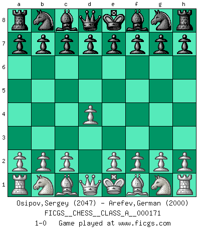 Last move : 1-0 2016 August 4 17:55:59 [Event "FICGS__CHESS__CLASS_A__000171"] [Site "FICGS"] [Date "2016.06.25"] [Round "1"] [White "Osipov,Sergey"] [Black "Arefev,German"] [Result "1-0"] [WhiteElo "2047"] [BlackElo "2000"] 1.d4 1-0 This chess game has been lost on time (started : 2016.06.25 13:31:50) Queen's pawn Player White won this chess game. Follow this game move after move (download)Chess is mental torture. (Garry Kasparov) Ohne Leiden bildet sich kein Charakter. (Ernst Freiherr von Feuchtersleben) La batalla por la última verdad nunca sera ganada. Y es por eso que el Ajedrez es tan fascinante. (Hans Kmoch) Les échecs c'est le défi de l'alpiniste, toujours plus haut, prêt à tout pour monter à l'assaut du Roi ennemi. Les échecs, c'est de la musique en mouvement, un ballet majestueux pour les yeux. C'est de la poésie composée par les fantômes du passé qui au même titre que Rimbaud ou Verlaine méritent notre admiration. Les échecs, c'est de la peinture ou le moindre mouvement modifie le tableau pour en faire un Picasso ou un Van Gogh. Les échecs, c'est tout et rien, c'est la vie et la mort. Jjulie33 sur le forum de France-Echecs. Work expands to fill the time available. (C. Northcote Parkinson, in Parkinson's Laws)