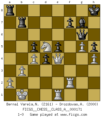 Last move : 1-0 2016 November 27 17:11:8 [Event "FICGS__CHESS__CLASS_A__000171"] [Site "FICGS"] [Date "2016.06.25"] [Round "1"] [White "Bernal Varela,Nelson"] [Black "Drozdovas,Arturas"] [Result "1-0"] [WhiteElo "2161"] [BlackElo "2000"] 1.e4 d6 2.d4 g6 3.c4 Bg7 4.Nc3 Nf6 5.Be2 O-O 6.Be3 Nbd7 7.Nf3 Ng4 8.Bg5 h6 9.Bh4 Ngf6 10.Nd2 e5 11.d5 a5 12.f3 Nc5 13.Nb3 b6 14.Nxc5 bxc5 15.g4 Qe7 16.Qd2 a4 17.O-O-O Rd8 18.Bf2 Bd7 19.Be3 Qf8 20.h4 Rdb8 21.Rh2 Rb6 22.Nb5 a3 23.b3 Rb7 24.Nc3 Rb6 25.Rdh1 Kh7 26.Bf1 Ne8 27.Bh3 Qe7 28.g5 h5 29.Bxd7 Qxd7 30.Rf2 c6 31.Rhf1 Ra7 32.dxc6 Qxc6 33.Nb5 Rd7 34.Nxa3 Nc7 35.Qd3 Kg8 36.Nb1 Ra6 37.Nc3 Ne6 38.Kb1 Ra8 39.Nb5 Re8 40.Rd1 R8e7 41.Qf1 Nd4 42.Nc3 Ne6 43.Rd5 Nc7 44.Rd3 Ne6 45.Nd5 Re8 46.Bd2 Rb7 47.Bc3 Qa4 48.R3d2 Nd4 49.Bxd4 exd4 50.Rh2 Qd7 51.Qd3 Qe6 52.Rde2 Kh8 53.f4 Qg4 54.Re1 Qd7 55.Rf2 Ra8 56.e5 dxe5 57.f5 Qd6 58.fxg6 Qxg6 59.Qe4 1-0 King's pawn Opening Kingside Castling by player Black (move 5) Queenside Castling by player White (move 17) Player White won this chess game. Follow this game move after move (download)Chess is a cold bath for the mind. (Sir John Simon) Kleine Schachspieler machen Mist, und große Schachspieler machen Mist, aber große machen weniger Mist. (Fritz Sämisch) No nos podemos resistir a la fascinación de un sacrificio ya que la pasión por los sacrificios es parte de la naturaleza de un jugador de Ajedrez. (Rudolf Spielman) Même si l'adversaire joue le coup analysé précédemment, recommencez l'analyse en voyant la nouvelle position. Première règle de Blumenfeld A proverb is a short sentence based on long experience. (Miguel de Cervantes)