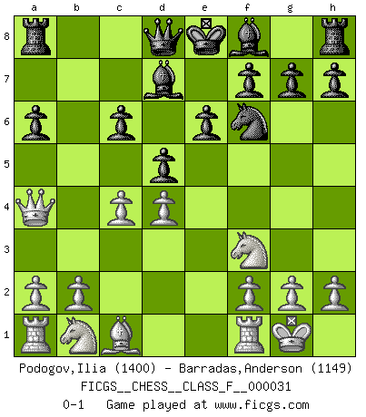 Last move : 0-1 2007 May 13 15:6:44 [Event "FICGS__CHESS__CLASS_F__000031"] [Site "FICGS"] [Date "2007.03.26"] [Round "1"] [White "Podogov,Ilia"] [Black "Barradas,Anderson"] [Result "0-1"] [WhiteElo "1400"] [BlackElo "1149"] 1.e4 c6 2.Nf3 d5 3.exd5 cxd5 4.d4 Nc6 5.Bb5 a6 6.Bxc6+ bxc6 7.O-O Nf6 8.c4 e6 9.Qa4 Bd7 0-1 This chess game has been lost on time (started : 2007.03.26 6:49:28) Caro-Kann defense Kingside Castling by player White (move 7) Player Black won this chess game. Follow this game move after move (download)Chess is above all, a fight ! (Emanuel Lasker) Man kann eine Schachpartie nur gewinnen, wenn das Gleichgewicht gestört ist. In einer Stellung mit ungestörtem Gleichgewicht ist auch das größte Genie hilflos - in der Stellung steckt dann eben kein genialer Einfall. (Wilhelm Steinitz) La batalla por la última verdad nunca sera ganada. Y es por eso que el Ajedrez es tan fascinante. (Hans Kmoch) Même un GMI sait rarement calculer sur plus de cinq coups une attaque à sacrifices. (Rudolf Spielmann) Go and wake up your luck. (Persian saying)