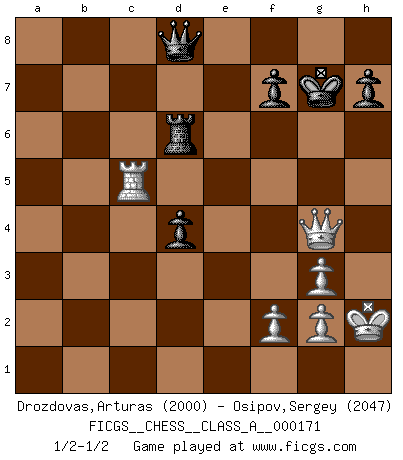 Last move : 1/2-1/2 2016 August 6 10:20:58 [Event "FICGS__CHESS__CLASS_A__000171"] [Site "FICGS"] [Date "2016.06.25"] [Round "1"] [White "Drozdovas,Arturas"] [Black "Osipov,Sergey"] [Result "1/2-1/2"] [WhiteElo "2000"] [BlackElo "2047"] 1.d4 d5 2.c4 e6 3.Nc3 Nf6 4.Nf3 Be7 5.Bf4 O-O 6.e3 Nbd7 7.c5 Nh5 8.Be2 Nxf4 9.exf4 c6 10.O-O Qc7 11.Qd2 b6 12.b4 a5 13.a3 Ba6 14.Bxa6 Rxa6 15.Qe2 Ra7 16.f5 e5 17.cxb6 Qxb6 18.dxe5 axb4 19.axb4 Rxa1 20.Rxa1 Qxb4 21.Qe1 Nc5 22.Qe3 Re8 23.Rb1 Qa5 24.f6 Bf8 25.fxg7 Bxg7 26.Ne2 Ne4 27.Ng3 Nxg3 28.hxg3 c5 29.Qb3 c4 30.Qb7 Qa8 31.Qd7 Qd8 32.Qb5 Bxe5 33.Rd1 c3 34.Nxe5 c2 35.Rc1 Rxe5 36.Rxc2 Re1+ 37.Kh2 Re6 38.Rc5 d4 39.Qd3 Kg7 40.Qf5 Rd6 41.Qg4+ Rg6 42.Qe4 Rd6 43.Qg4+ Rg6 44.Qe4 Rd6 45.Qg4+ 1/2-1/2 QGD : Classical variation (5.Bf4) Kingside Castling by player Black (move 5) Kingside Castling by player White (move 10) This chess game ended in a draw. Follow this game move after move (download)Combinations have always been the most intriguing aspect of Chess. The masters look for them, the public applauds them, the critics praise them. It is because combinations are possible that Chess is more than a lifeless mathematical exercise. They are the poetry of the game; they are to Chess what melody is to music. They represent the triumph of mind over matter. (Reuben Fine) Du musst nicht gut spielen, es reicht, wenn du besser spielst als dein Gegner. (Anonymous) Todo se encuentra en un estado de flujo y esto incluye al mundo del Ajedrez. (Mikhail Botvinnik) Je ne suis pas le dernier à jouer lâchement des coups douteux pendant le zeïtnot de l'adversaire pour l'achever: en effet les coups qui font le plus peur sont ceux que l'on ne comprend pas. Je me fais souvent peur quand je joue. (Un professeur anonyme) I don't believe in psychology. I believe in good moves. (Bobby Fischer)