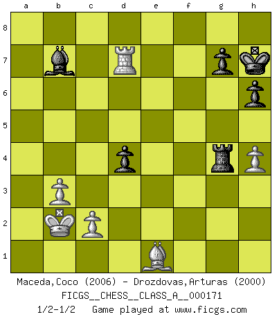 Last move : 1/2-1/2 2017 April 2 18:56:6 [Event "FICGS__CHESS__CLASS_A__000171"] [Site "FICGS"] [Date "2016.06.25"] [Round "1"] [White "Maceda,Coco"] [Black "Drozdovas,Arturas"] [Result "1/2-1/2"] [WhiteElo "2006"] [BlackElo "2000"] 1.e4 c5 2.Nf3 d6 3.d4 cxd4 4.Nxd4 Nc6 5.Nc3 Nf6 6.Bg5 e6 7.Qd2 Be7 8.O-O-O O-O 9.f4 Nxd4 10.Qxd4 Qa5 11.Bc4 Bd7 12.e5 dxe5 13.fxe5 Bc6 14.Bd2 Nd7 15.Nd5 Qd8 16.Nxe7+ Qxe7 17.Rhe1 b5 18.Bf1 a5 19.Qd6 Qxd6 20.exd6 b4 21.Bf4 Rfd8 22.b3 Bd5 23.Kb1 Nb6 24.Kb2 h6 25.Bb5 Rac8 26.Be3 Rxd6 27.a3 Na8 28.axb4 axb4 29.Rd4 Nc7 30.Bf1 Rc6 31.g3 Rb8 32.Bd2 Rcb6 33.Bf4 Rc8 34.Ra1 Bc6 35.Be3 R6b8 36.Bd2 Nd5 37.Rc4 Rb6 38.Bg2 Rcb8 39.Be1 Be8 40.Bf3 Rb5 41.Ra7 R5b6 42.h4 Rb5 43.Bd2 Kh7 44.Bxd5 exd5 45.Rg4 R8b6 46.Rc7 Rg6 47.Rd4 Rxg3 48.Re7 Bc6 49.Rxf7 Rb7 50.Rxb7 Bxb7 51.Rxb4 Ba6 52.Ra4 Bc8 53.Ra5 d4 54.Rc5 Ba6 55.Ra5 Bc8 56.Rd5 Rg4 57.Be1 Bb7 58.Rd7 1/2-1/2 Sicilian Queenside Castling by player White (move 8) Kingside Castling by player Black (move 8) This chess game ended in a draw. Follow this game move after move (download)My style is somewhere between that of Tal and Petrosian. (Reshevsky) Es ist besser die Steine des Gegners zu opfern. (Savielly Grigorievitsch Tartakower) Las combinaciones han sido siempre el aspecto más intrigante del Ajedrez. Los Maestros las buscan, el público las aplauden, los críticos las alaban. La razón se debe a que las combinaciones hacen posible que el Ajedrez sea más que un ejercicio matemático con una carencia de vida. Ellas son la poesía del juego, son del Ajedrez lo que la melodía es de la música. Ellas representan el triunfo de la mente sobre la materia. (Reuben Fine) Shah mat. Le roi est mort. Cri de fierté d'un joueur venant de terrasser son adversaire, courtoisement, sans effusion de sang. You must do what you feel is right... of course. (Obi-Wan Kenobi in Star Wars ep.4)