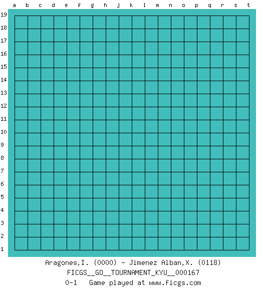 Last move : 0-1 2016 July 25 15:57:51 [Event "FICGS__GO__TOURNAMENT_KYU__000167"] [Site "FICGS"] [Date "2016.06.25"] [Round "1"] [Black "Aragones,Inti"] [White "Jimenez Alban,Xavier Miguel"] [Result "0-1"] [Rating 1 "0000"] [Rating 2 "0118"] 0-1 This go game has been lost on time (started : 2016.06.25 15:44:3) Here are the names of the openings (joseki) played in the four corners : Player White won this Go (weiqi, baduk) game. Follow this game move after move (download)Don't reduce your own liberties. (Bill Taylor) Home computers are being called upon to perform many new functions, including the consumption of homework formerly eaten by the dog. (Doug Larson)