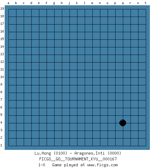 Last move : 1-0 2016 July 25 15:57:51 [Event "FICGS__GO__TOURNAMENT_KYU__000167"] [Site "FICGS"] [Date "2016.06.25"] [Round "1"] [Black "Lu,Hong"] [White "Aragones,Inti"] [Result "1-0"] [Rating 1 "0100"] [Rating 2 "0000"] 1.q4 1-0 This go game has been lost on time (started : 2016.06.25 15:44:3) Here are the names of the openings (joseki) played in the four corners : Corner q4 : q4 1-0 Hoshi (Hwajeom, Seongjeom, Xingwei`) 4-4 Point. The star or hoshi (4-4) point, emphasizing influence at the potential expense of territory. Player Black won this Go (weiqi, baduk) game. Follow this game move after move (download)Don't make a play adjacent to a cutting-point. (Anonymous) No, no, you're not thinking; you're just being logical. (Niels Bohr)