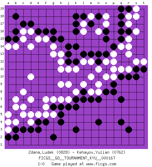Last move : 1-0 2016 October 15 22:56:28 [Event "FICGS__GO__TOURNAMENT_KYU__000167"] [Site "FICGS"] [Date "2016.06.25"] [Round "1"] [Black "Zdana,Ludek"] [White "Kehayov,Yulian"] [Result "1-0"] [Rating 1 "0828"] [Rating 2 "0762"] 1.q16 d4 2.q4 c16 3.q10 d10 4.k16 g5 5.k3 g14 6.f16 e15 7.d17 d16 8.e16 f15 9.g16 r17 10.q17 r18 11.q18 r15 12.q15 r14 13.o15 r13 14.g2 h9 15.b5 b4 16.e4 d5 17.c7 c5 18.c3 e5 19.e3 b6 20.d3 c6 21.c17 d14 22.q7 r11 23.r10 q11 24.r3 d7 25.n4 c8 26.h4 p10 27.p9 o10 28.p8 p11 29.k14 k11 30.k6 j7 31.k7 k8 32.m7 m8 33.n7 n8 34.g6 f6 35.h6 h7 36.j6 g7 37.o8 n9 38.o13 p12 39.m13 m12 40.l13 l12 41.k12 j11 42.j12 h11 43.h15 g13 44.r16 s16 45.r19 s18 46.b16 c15 47.b15 b14 48.b18 o12 49.p14 p13 50.n12 n11 51.n13 m10 52.f4 f5 53.h5 f7 54.s11 s12 55.s10 s19 56.q19 h12 57.j14 h13 58.j13 t12 59.t11 q14 60.b3 a5 61.l8 l9 62.l7 j9 63.g15 a3 64.a2 a4 65.b2 a14 66.a15 b7 67.pass l17 68.k17 n16 69.o16 o17 70.l18 m18 71.k18 l16 72.n18 o18 73.m17 1-0 Here are the names of the openings (joseki) played in the four corners : Corner q16 : q16 r17 Hoshi (Hwajeom, Seongjeom, Xingwei`) 4-4 Point. The star or hoshi (4-4) point, emphasizing influence at the potential expense of territory. Player Black won this Go (weiqi, baduk) game. Follow this game move after move (download)The game plays itself, the players don't control it. (Pierre Audouard) Wikichess, chess moves explained by 'experimented' players. (Thibault de Vassal)