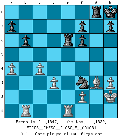 Last move : 0-1 2007 July 8 22:55:4 [Event "FICGS__CHESS__CLASS_F__000031"] [Site "FICGS"] [Date "2007.03.26"] [Round "1"] [White "Perrotta,John Zach"] [Black "Kis-Kos,Laszlo"] [Result "0-1"] [WhiteElo "1347"] [BlackElo "1332"] 1.b4 e5 2.Bb2 Bxb4 3.Bxe5 Nf6 4.a3 Be7 5.Nc3 d6 6.Bg3 O-O 7.Nf3 Nc6 8.e4 Re8 9.Bc4 Nxe4 10.Nxe4 d5 11.Bxd5 Qxd5 12.d3 Bg4 13.h3 Bxf3 14.Qxf3 Bf6 15.O-O Kh8 16.Nxf6 Qxf3 17.gxf3 gxf6 18.Bxc7 Rac8 19.Bg3 Nd4 20.c4 Nxf3+ 21.Kg2 Nd4 22.Rfe1 Re6 23.Rab1 b6 24.a4 Rg8 25.Kh2 Nf3+ 0-1 Polish (Sokolsky) opening Kingside Castling by player Black (move 6) Kingside Castling by player White (move 15) Player Black won this chess game. Follow this game move after move (download)There are two types of sacrifices: correct ones and mine. (Mikhail Tal) Wenn ich gewinne bin ich ein Genie. Wenn nicht, dann bin ich keines. (Robert James Fischer) El Ajedrez no es como la vida... ¡tiene reglas!. (Mark Pasternak) On croit qu'il y a plus de mauvais joueurs que de bons joueurs, c'est faux : Il y a autant de joueurs qui gagnent que de joueurs qui perdent. (Philippe Geluck) I live to kill Traxler counterattack. (Ilmars Cirulis)