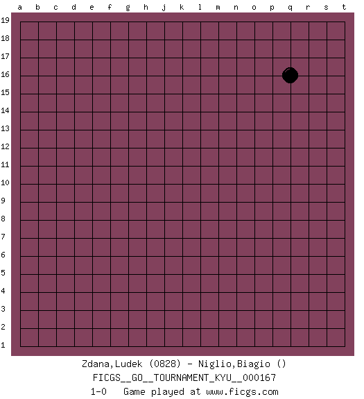 Last move : 1-0 2016 July 14 19:52:52 [Event "FICGS__GO__TOURNAMENT_KYU__000167"] [Site "FICGS"] [Date "2016.06.25"] [Round "1"] [Black "Zdana,Ludek"] [White "Niglio,Biagio"] [Result "1-0"] [Rating 1 "0828"] 1.q16 1-0 Here are the names of the openings (joseki) played in the four corners : Player Black won this Go (weiqi, baduk) game. Follow this game move after move (download)Don't make territory near thickness. (Anonymous) Imagination is more important than knowledge. Knowledge is limited. Imagination encircles the world. (Albert Einstein)