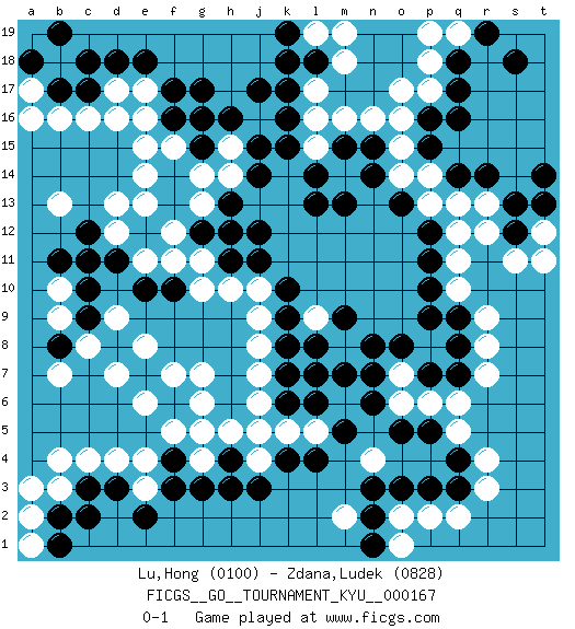 Last move : 0-1 2016 November 5 15:51:10 [Event "FICGS__GO__TOURNAMENT_KYU__000167"] [Site "FICGS"] [Date "2016.06.25"] [Round "1"] [Black "Lu,Hong"] [White "Zdana,Ludek"] [Result "0-1"] [Rating 1 "0100"] [Rating 2 "0828"] 1.q4 d16 2.q16 d4 3.f17 e17 4.f16 d13 5.k17 o17 6.q17 o15 7.q14 q10 8.q8 q6 9.o8 p8 10.p7 r8 11.q7 r7 12.q9 r9 13.p10 q11 14.p11 r3 15.q3 r4 16.f3 e3 17.f4 d7 18.l4 k5 19.k4 j4 20.j3 h5 21.h4 j5 22.g3 m8 23.l7 l5 24.m7 j7 25.n8 l9 26.o13 l15 27.k15 l16 28.k16 r13 29.r14 q13 30.l13 l17 31.k8 g10 32.k9 j10 33.k10 j8 34.f6 g7 35.f13 e11 36.j11 h10 37.h11 g11 38.g12 f7 39.l14 p18 40.q18 p17 41.p16 o16 42.l18 m18 43.k19 m19 44.c17 d17 45.d18 c16 46.b17 b16 47.e18 e15 48.m5 q5 49.p5 p6 50.o5 o6 51.n6 o7 52.p9 e6 53.c3 c4 54.d3 e4 55.e2 b3 56.c2 f5 57.b2 b4 58.c12 d12 59.c11 b9 60.c9 b10 61.d11 c8 62.e10 f12 63.f10 f11 64.d8 d9 65.c10 e8 66.f14 e13 67.b8 b7 68.b11 b13 69.s13 r12 70.s12 s11 71.m15 m16 72.n15 n16 73.n14 a17 74.a18 b18 75.c18 q2 76.p3 p2 77.o3 o2 78.n2 m2 79.n1 n4 80.n3 o1 81.b19 a16 82.p12 t12 83.t14 f15 84.g15 g13 85.h13 h12 86.j12 h14 87.g12 g14 88.j14 h15 89.h16 g16 90.g17 j16 91.g15 e14 92.j15 o14 93.h12 p14 94.p15 p13 95.m13 j9 96.n7 g5 97.l6 q19 98.r19 p19 99.s18 g16 100.j17 l19 101.k18 g4 102.h3 a2 103.k6 j6 104.k7 a1 105.b1 a3 106.t13 t11 107.g15 q12 108.g16 e16 109.m9 pass 110.pass g6 111.l8 pass 112.pass pass 113.pass pass 114.pass pass 115.pass pass 0-1 Here are the names of the openings (joseki) played in the four corners : Corner d16 : d16 f17 Hoshi (Hwajeom, Seongjeom, Xingwei`) 4-4 Point. The star or hoshi (4-4) point, emphasizing influence at the potential expense of territory. Ikken Kakari (Hankan Keolch'im, Yi Gua`jiao~, 1-Space Low Approach). Black 2 is the standard approach move to the 4-4. Corner q16 : q16 o17 Hoshi (Hwajeom, Seongjeom, Xingwei`) 4-4 Point. The star or hoshi (4-4) point, emphasizing influence at the potential expense of territory. Ikken Kakari (Hankan Keolch'im, Yi Gua`jiao~, 1-Space Low Approach). White 2 is the standard approach move to the 4-4. Corner d4 : d4 f3 Hoshi (Hwajeom, Seongjeom, Xingwei`) 4-4 Point. The star or hoshi (4-4) point, emphasizing influence at the potential expense of territory. Ikken Kakari (Hankan Keolch'im, Yi Gua`jiao~, 1-Space Low Approach). Black 2 is the standard approach move to the 4-4. Player White won this Go (weiqi, baduk) game. Follow this game move after move (download)There are possible things, impossible things, and things that happen. Sometimes things happen that were impossible. (Pierre Audouard) Programming can only do so much before it becomes too much. (Don Groves)