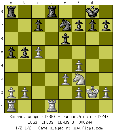 Last move : 1/2-1/2 2016 August 9 15:35:47 [Event "FICGS__CHESS__CLASS_B__000244"] [Site "FICGS"] [Date "2016.06.26"] [Round "1"] [White "Romano,Jacopo"] [Black "Duenas,Alexis"] [Result "1/2-1/2"] [WhiteElo "1938"] [BlackElo "1924"] 1.d4 Nf6 2.c4 e6 3.g3 d5 4.Nf3 Be7 5.Bg2 O-O 6.O-O dxc4 7.Qc2 a6 8.Qxc4 b5 9.Qc2 Bb7 10.Bd2 Be4 11.Qc1 Bb7 12.Bf4 Bd6 13.Nbd2 Bxf4 14.gxf4 Qd6 15.Nb3 Nbd7 16.Rd1 a5 17.Ne5 Bxg2 18.Kxg2 Rfd8 19.Nc5 Nxc5 20.Qxc5 Qxc5 21.dxc5 Nd5 22.e3 Ne7 23.Nf3 1/2-1/2 Catalan Opening Kingside Castling by player Black (move 5) Kingside Castling by player White (move 6) This chess game ended in a draw. Follow this game move after move (download)Discovered check is the dive bomber of the Chessboard. (Reuben Fine) Die Elozahlen sind sehr schlecht für das Schach. Jetzt ist Schach eine Sportindustrie, die darauf zielt Elopunkte zu machen. (Miguel Najdorf) Todavía soy una víctima del Ajedrez. Tiene toda la belleza del arte y mucho mas. No puede ser comercializado. El Ajedrez es mas puro que el arte en su posición social. (Marcel Duchamp) Toutes choses étant égales, c'est la conviction qui gagne. Alliée à une volonté de vaincre, elle sert de détonateur, suscite des idées, disperse les doutes et aide à penser clairement. (Robert Fischer) Train yourself to let go of everything you fear to lose. (Master Yoda in Star Wars ep.3)