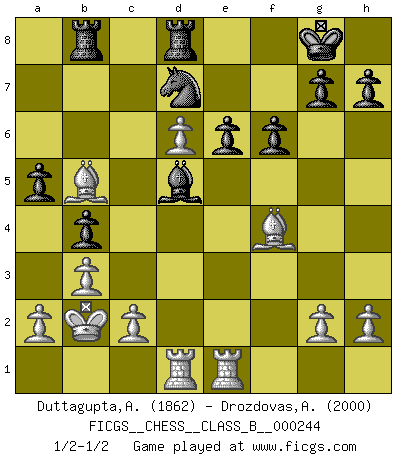 Last move : 1/2-1/2 2016 July 24 9:42:39 [Event "FICGS__CHESS__CLASS_B__000244"] [Site "FICGS"] [Date "2016.06.26"] [Round "1"] [White "Duttagupta,Aniruddha"] [Black "Drozdovas,Arturas"] [Result "1/2-1/2"] [WhiteElo "1862"] [BlackElo "2000"] 1.e4 c5 2.Nf3 d6 3.d4 cxd4 4.Nxd4 Nc6 5.Nc3 Nf6 6.Bg5 e6 7.Qd2 Be7 8.O-O-O O-O 9.f4 Nxd4 10.Qxd4 Qa5 11.Bc4 Bd7 12.e5 dxe5 13.fxe5 Bc6 14.Bd2 Nd7 15.Nd5 Qc5 16.Nxe7+ Qxe7 17.Rhe1 b5 18.Bf1 a5 19.Qd6 Qxd6 20.exd6 b4 21.Bf4 Rfd8 22.b3 Bd5 23.Kb2 f6 24.Bb5 Rab8 1/2-1/2 Sicilian Queenside Castling by player White (move 8) Kingside Castling by player Black (move 8) This chess game ended in a draw. Follow this game move after move (download)There are two types of sacrifices: correct ones and mine. (Mikhail Tal) Im Reiche der Wirklichkeit ist man nie so glücklich wie im Reiche der Gedanken. (Arthur Schopenhauer) Por tratar de evitar la pérdida de una pieza, muchas personas han perdido una partida de Ajedrez. (Savielly Tartakover) La vérité est comme le meilleur coup aux échecs : elle existe, mais il faut la chercher. (Arturo Perez-Reverte) Pretend inferiority and encourage his arrogance. (Sun Tzu)