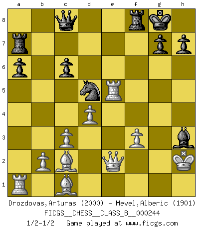 Last move : 1/2-1/2 2016 November 16 19:27:3 [Event "FICGS__CHESS__CLASS_B__000244"] [Site "FICGS"] [Date "2016.06.26"] [Round "1"] [White "Drozdovas,Arturas"] [Black "Mevel,Alberic"] [Result "1/2-1/2"] [WhiteElo "2000"] [BlackElo "1901"] 1.e4 e5 2.Nf3 Nc6 3.Bb5 a6 4.Ba4 Nf6 5.O-O Be7 6.Re1 b5 7.Bb3 O-O 8.c3 d5 9.exd5 Nxd5 10.Nxe5 Nxe5 11.Rxe5 c6 12.d3 Bd6 13.Re1 Qh4 14.g3 Qh3 15.Re4 Qf5 16.Nd2 Qg6 17.Re1 f5 18.a4 bxa4 19.Bxa4 Bc7 20.Nf3 f4 21.Ne5 Bxe5 22.Rxe5 Bg4 23.f3 Bh3 24.d4 fxg3 25.Rg5 gxh2+ 26.Kxh2 Qe6 27.Re5 Qc8 28.Qe2 Ra7 29.Bc2 1/2-1/2 Ruy Lopez : Closed, 7...O-O Kingside Castling by player White (move 5) Kingside Castling by player Black (move 7) This chess game ended in a draw. Follow this game move after move (download)Pawns are born free, yet they are everywhere in chains. (Rick Kennedy) Jeder Schachmeister war einmal ein Anfänger. (Irving Chernev) Aquellos que dicen entender al Ajedrez, no entienden nada. (Robert Hubner) La menace est plus forte que l'exécution. (Aaron Nimzovitch) In God we trust, all others we virus scan. (Anonymous)